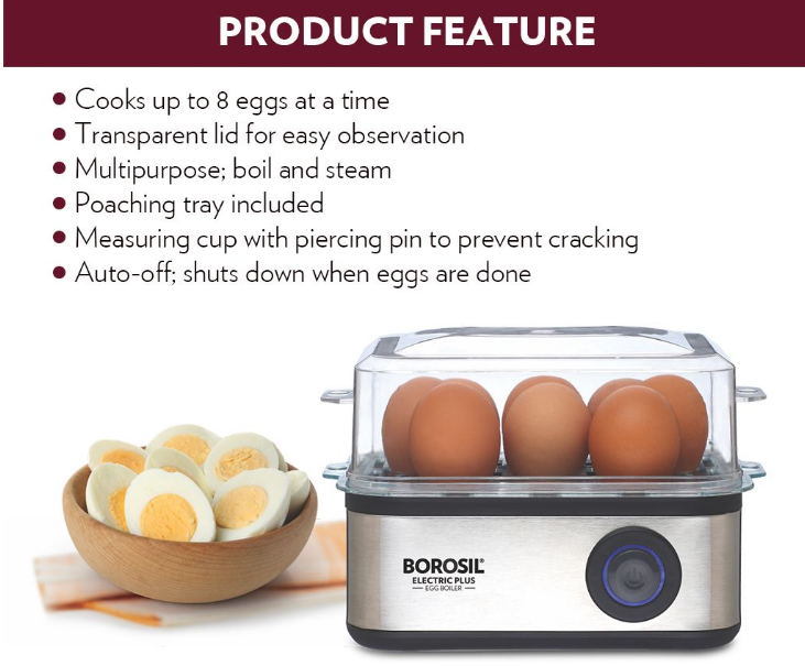 Egg-cellent results every time, that's what our electric cooker delivers. The 8 egg capacity cooker easily cooks enough eggs for weekday breakfasts and weekend family brunches. Choose from three boiling modes, hard, medium, soft for eggs and use a poaching tray to poach eggs or steam your veggies - the options are plenty. It's easy to operate; all you have to do is add the appropriate quantity of water as per your desired mode, put on the lid and wait for a few short minutes. The auto-off function takes the guesswork out of the cooking process as the appliance shuts off once the cooking is done so you're left with perfect eggs, every morning.