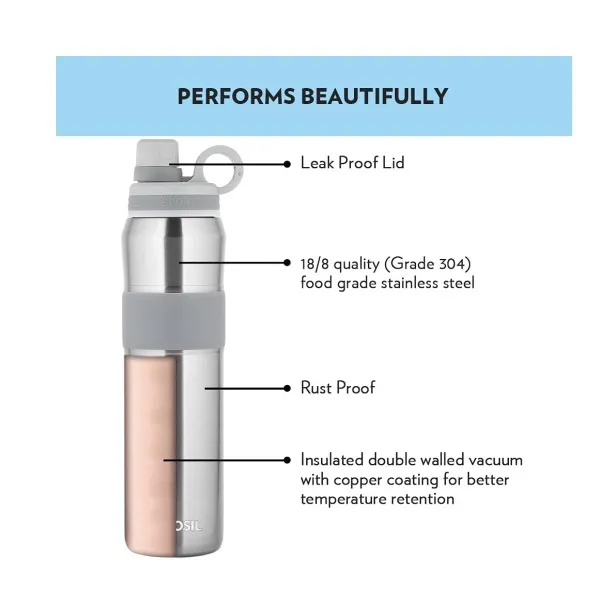• COPPER COATED DOUBLE-WALL VACUUM INSULATION - The double wall vacuum insulation of the water bottle maintains the temperature of its contents for hours and prevents condensation from forming on the bottle's exterior.