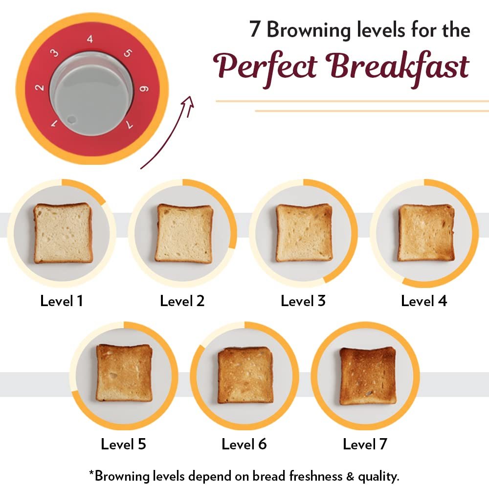 WIDE SLOTS & 7 HEAT SETTINGS - Comfortably fits bread of all sizes and toasts bread as per your requirement. Comes with dual bread guides for perfect browning, 7 temperature control settings and it has defrost, reheat and cancel options so you can quickly ready frozen bagels or bread.