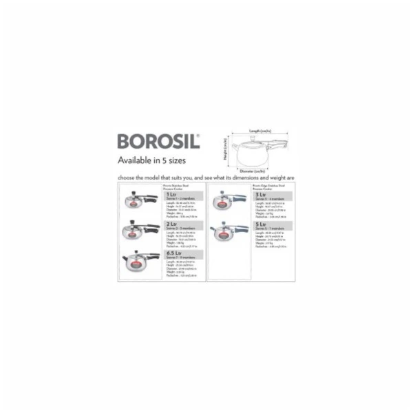 Borosil range of Pronto stainless steel pressure cookers have been designed to provide you with the best, safest and most efficient cooking experience. The unique 6.8 mm thick base transfers heat faster to speed up your cooking and save fuel cost. The food grade SS304 body ensures that your cooker will never corrode or pit. The stay cool handles are designed for easy handling and convenience, and you can be rest assured that we have best-in-class safety features available in Borosil Pronto stainless steel pressure cookers. Built with Borosil quality standards, this pressure cooker is one purchase you will be happy you made!