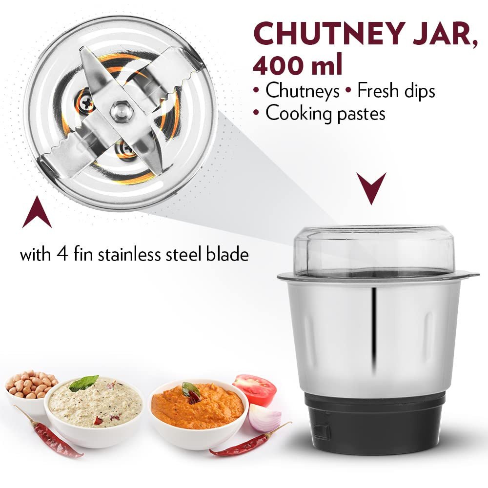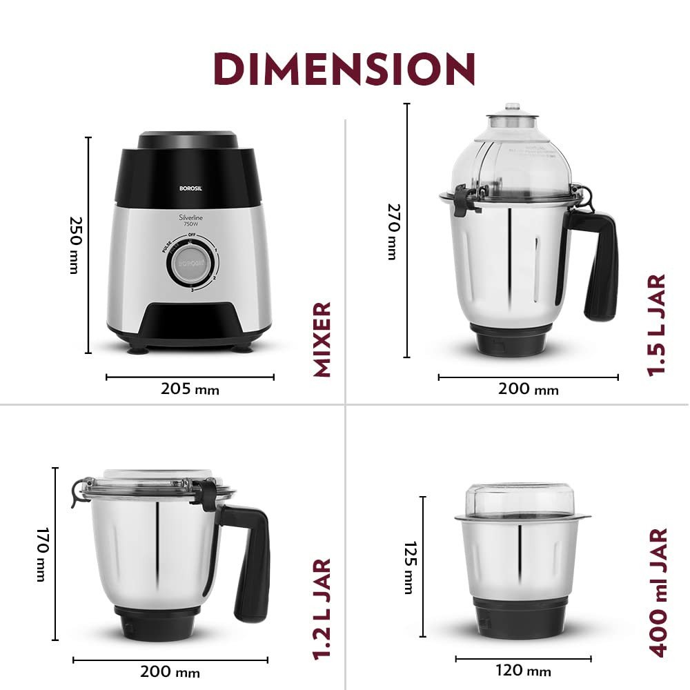 - STRONG BLADES - Equipped with a 750 watt motor, the Borosil mixer grinder easily grinds or pulverises the hardest of ingredients. This set consists of three jars with unbreakable lids- 1.5 L Blending Jar with Clip Locking mechanism for hands free operation, 1.2 L Dry / Wet Chutney Grinder with Clip Locking mechanism for hands free operation and 400 ml Chutney / Masala Grinder with Push Locking mechanism.