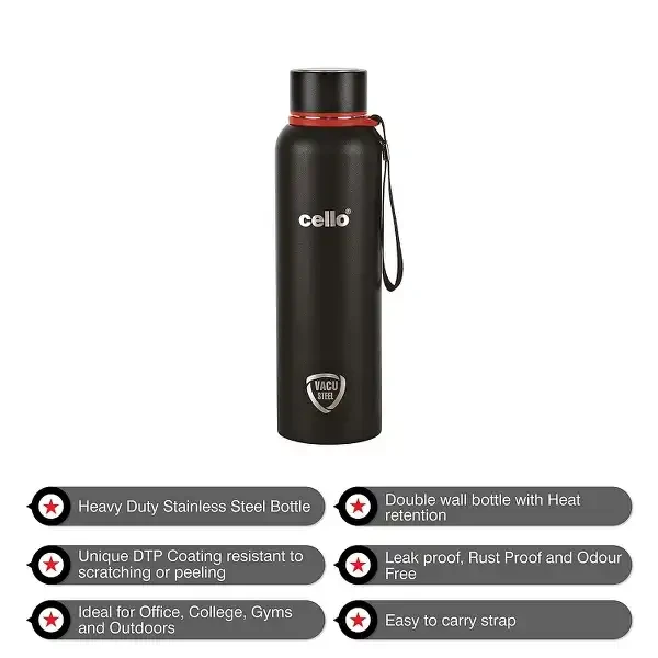 Cello presents the Duro Series of Tuff Steel insulated bottles that you can carry with you on treks, hiking, cycling, to the gym, school or office with ease. Designed with new and advanced DTP coating the colour of the bottles will not fade or scratch with use. Enjoy an active lifestyle while your bottle stays brand new, even with everyday wear and tear. The Duro Tuff Steel Kent bottle is manufactured in food safe double wall heavy duty stainless steel. The vaccusteel technology ensures that the bottles retain temperature of beverages upto 24 hours so you can enjoy your hot or cold drink longer. The 304 grade stainless steel does not oxidize or leach chemicals hence keeping the beverage healthy at all times. Compact and designed for the get go, this bottle comes with a sturdy wrist loop for better portability.