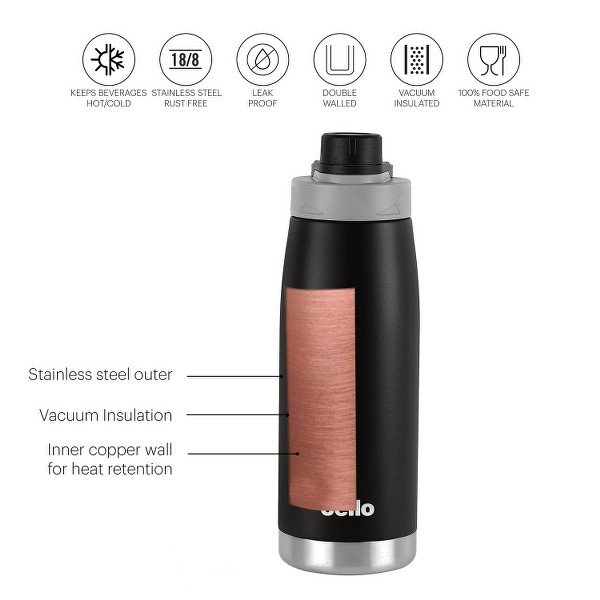 - Vacusteel Technology comes with a double stainless wall with Copper coating on the inside to minimize loss of temperature and keep beverages hot or cold for a prolonged period of time.