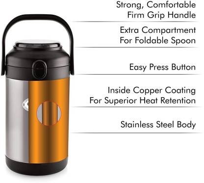 A very trendy lunch box that comes with a smooth and wide mouth making it easy to handle and clean. It comes with a stylish carry case for portability. Keeps your home-cooked meals fresh, tasty, and healthy. So that you can enjoy your favorite meal anytime and on the go. It has an inside copper coating for superior heat retention to give you one of the best performances. Keeps your food warm and fresh. The lunch box fits comfortably in your office or school bag and is stylish enough to carry. You can carry food in your Cello Fredo lunch box for work or even a day outdoors. The leakproof containers are ideal for carrying liquids and a variety of other food. It is airtight and seals the temperature inside which keeps your meals fresh and tasty all day long.