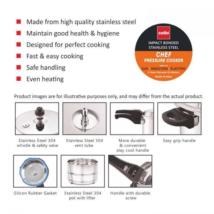 New Cello Chef Pressure Cooker is probably the most useful and versatile product in the Indian kitchen and has been carefully designed with the discerning customer like you in mind. Cello Chef pressure cooker keeping in the mind the ever growing requirements of the customer, has come out with a cooker which now can be used on Induction cook-tops. This pressure cooker is quality tested to ensute maximum safety & durability. We wish you very happy times in cooking and serving delicious and authentic cuisine that you so lovingly serve to your family.