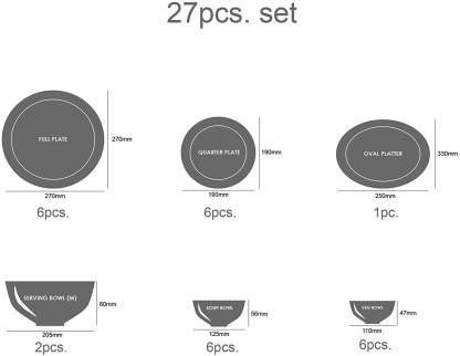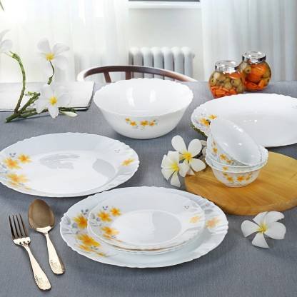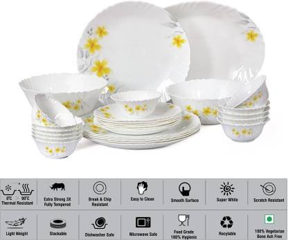 Package Contents: 6-Pieces Full Plate, 6-Pieces Quarter Plate, 6-Pieces Veg Bowl (190ml), 2-Pieces Medium Serving Bowl (1.37 Litres), 1-Piece Oval Platter and 6-Pieces Soup Bowl (290ml)
