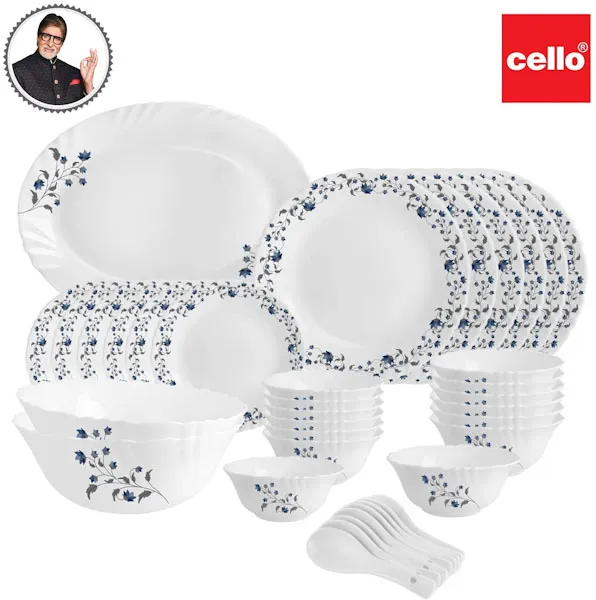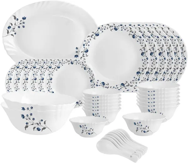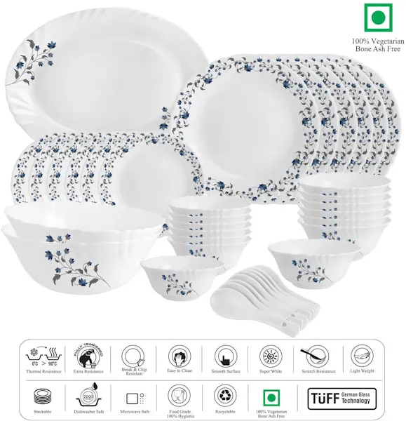 Package Contents: 6-Pieces Full Plate(11 inch), 6-Pieces Quarter Plate(7.5 inch), 6-Pieces Veg Bowl (190ml), 2-Pieces Medium Serving Bowl (1.37 Litres), 1-Piece Oval Platter, 6-Pieces Soup Bowl (290ml) and 6-Pieces Soup Spoons