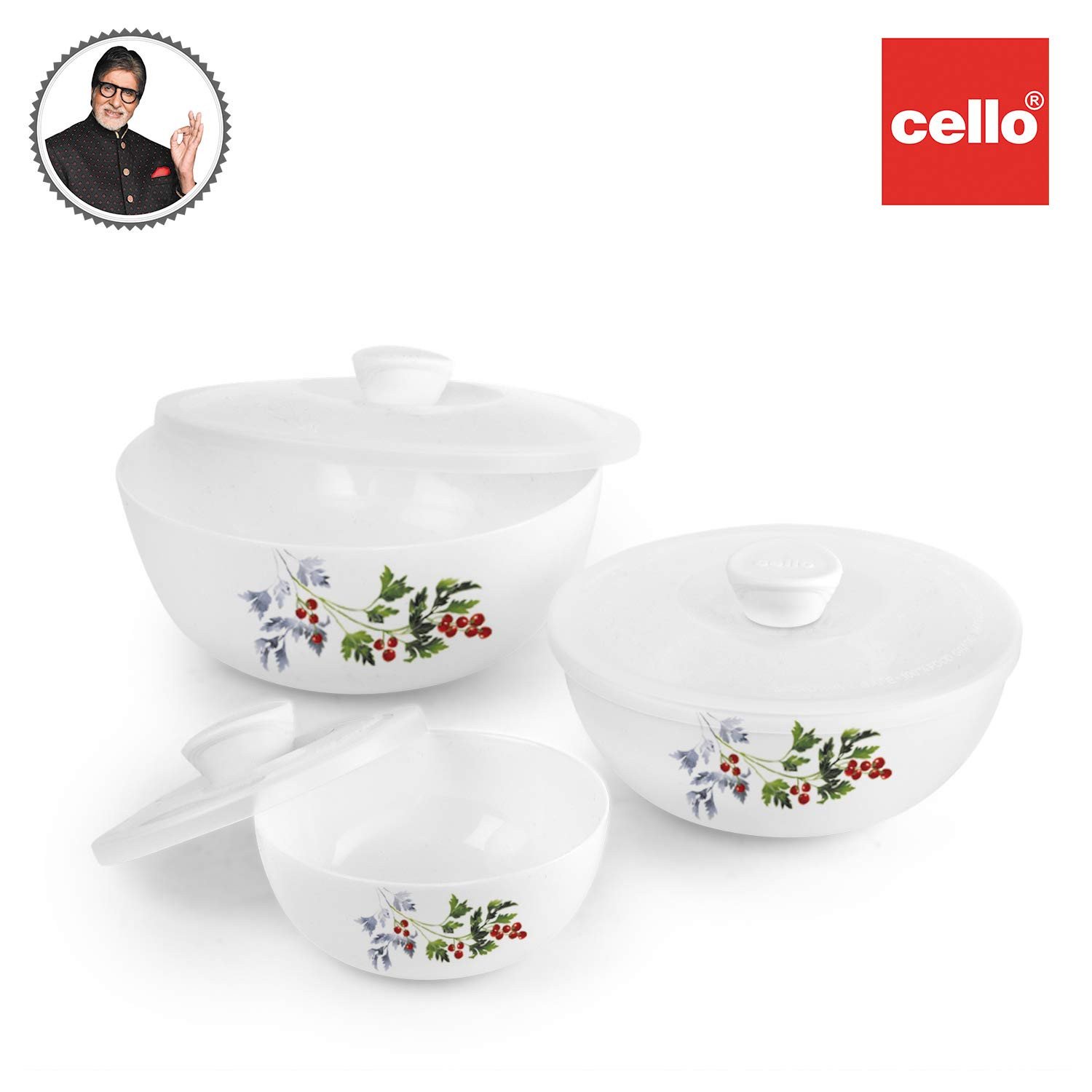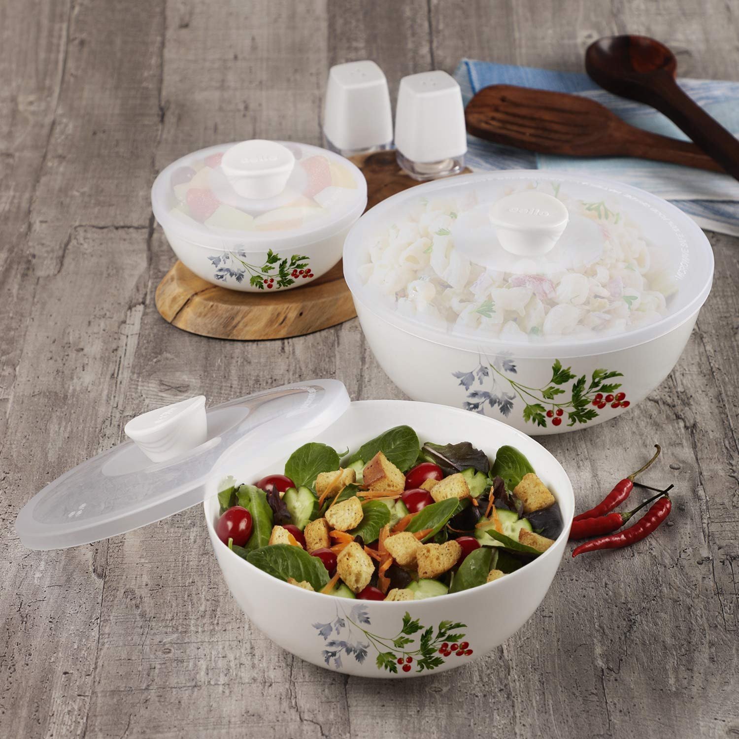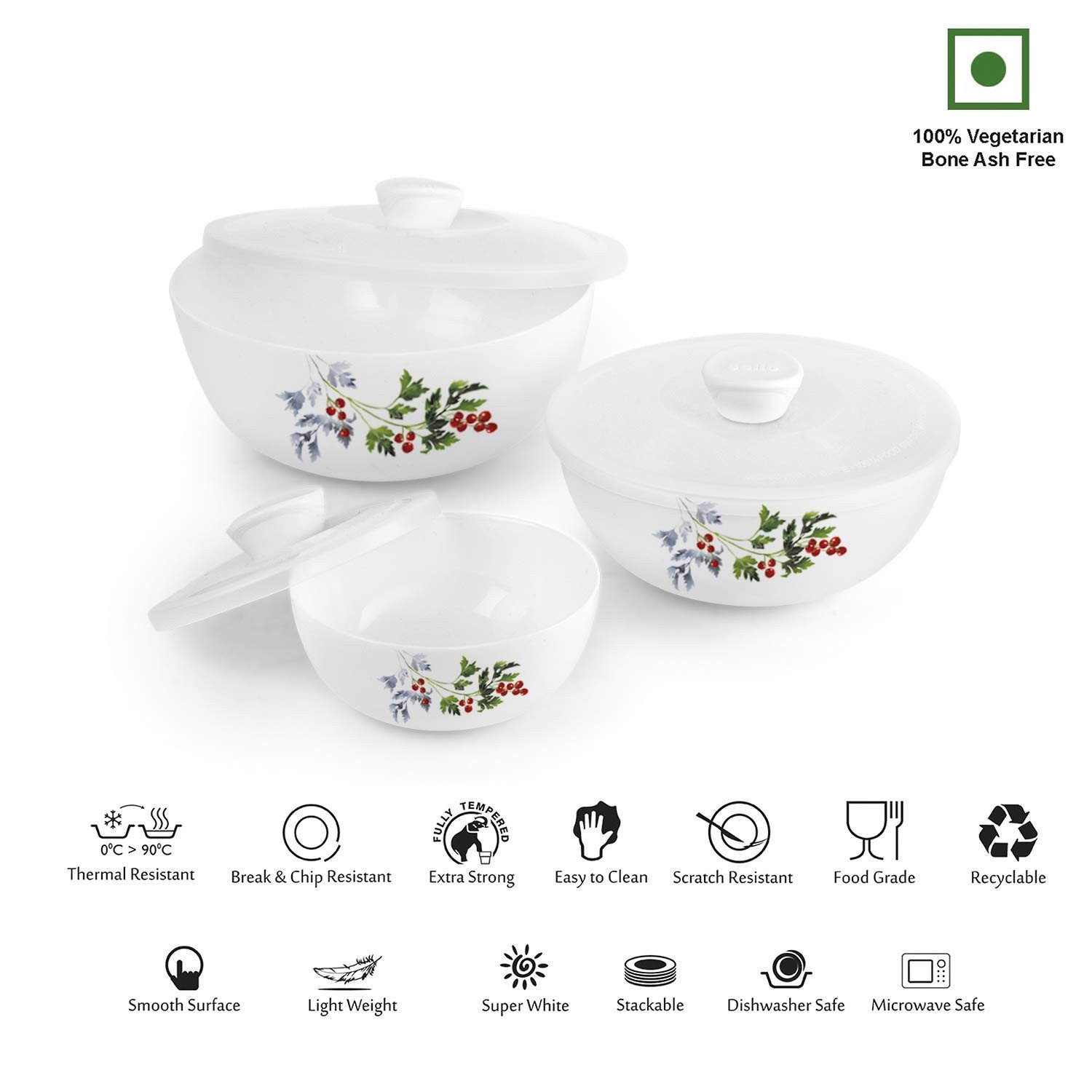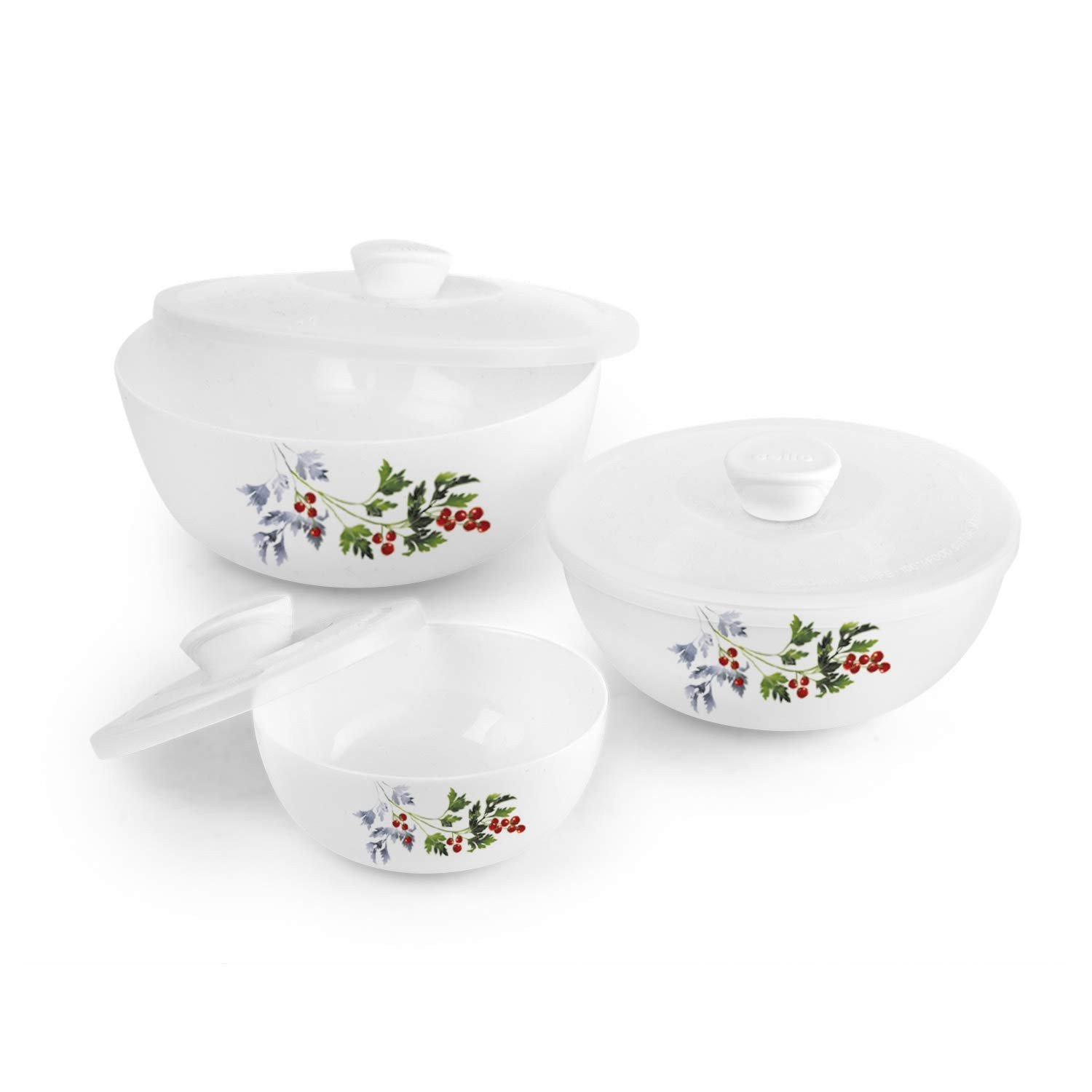 Included Components : 1 Large Serving Bowl + Lid 200mm, 1 Medium Serving Bowl + Lid 175mm & 1 Small Serving Bowl + Lid 125mm