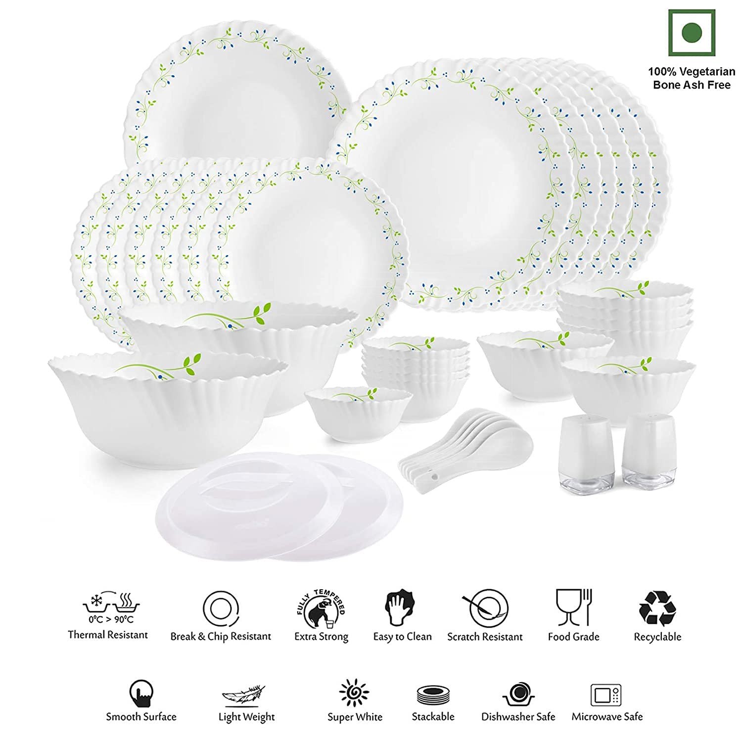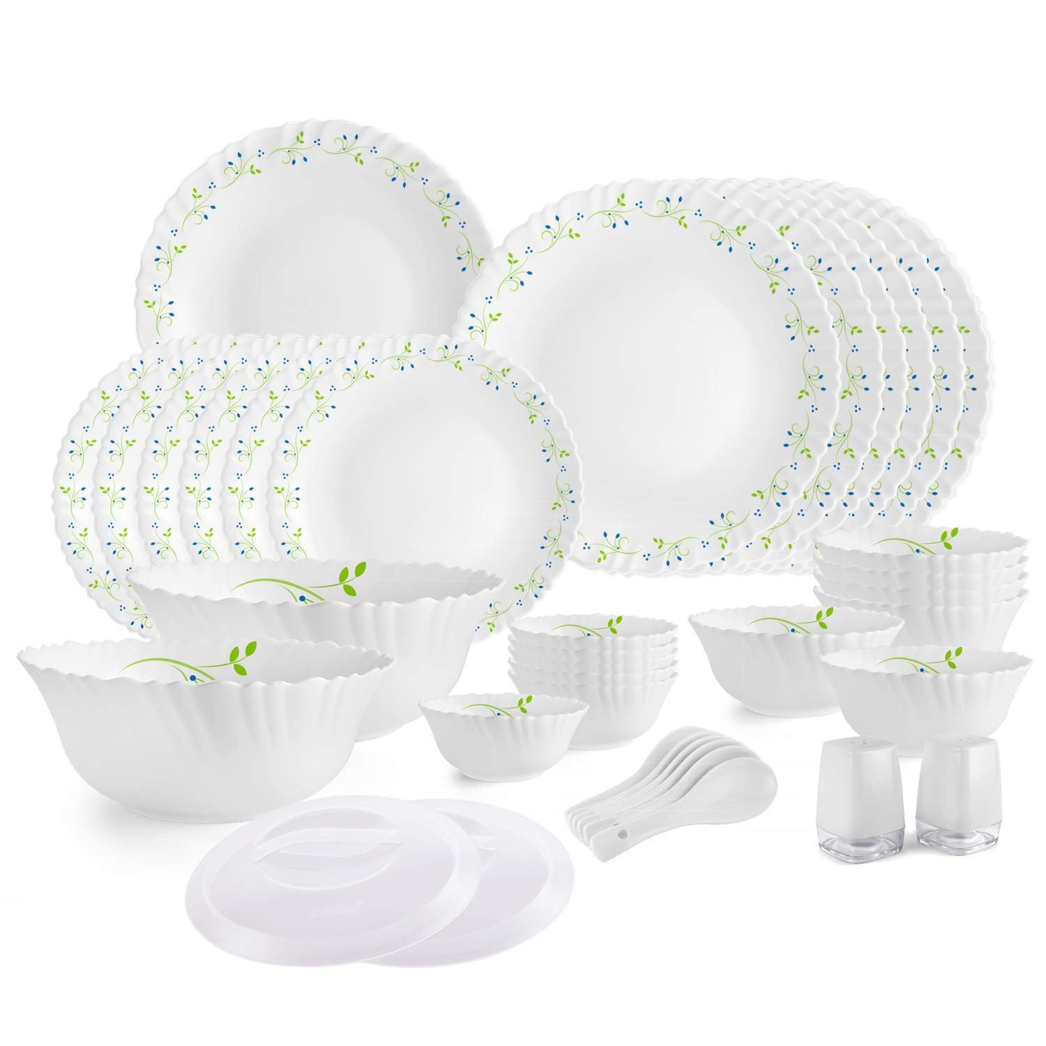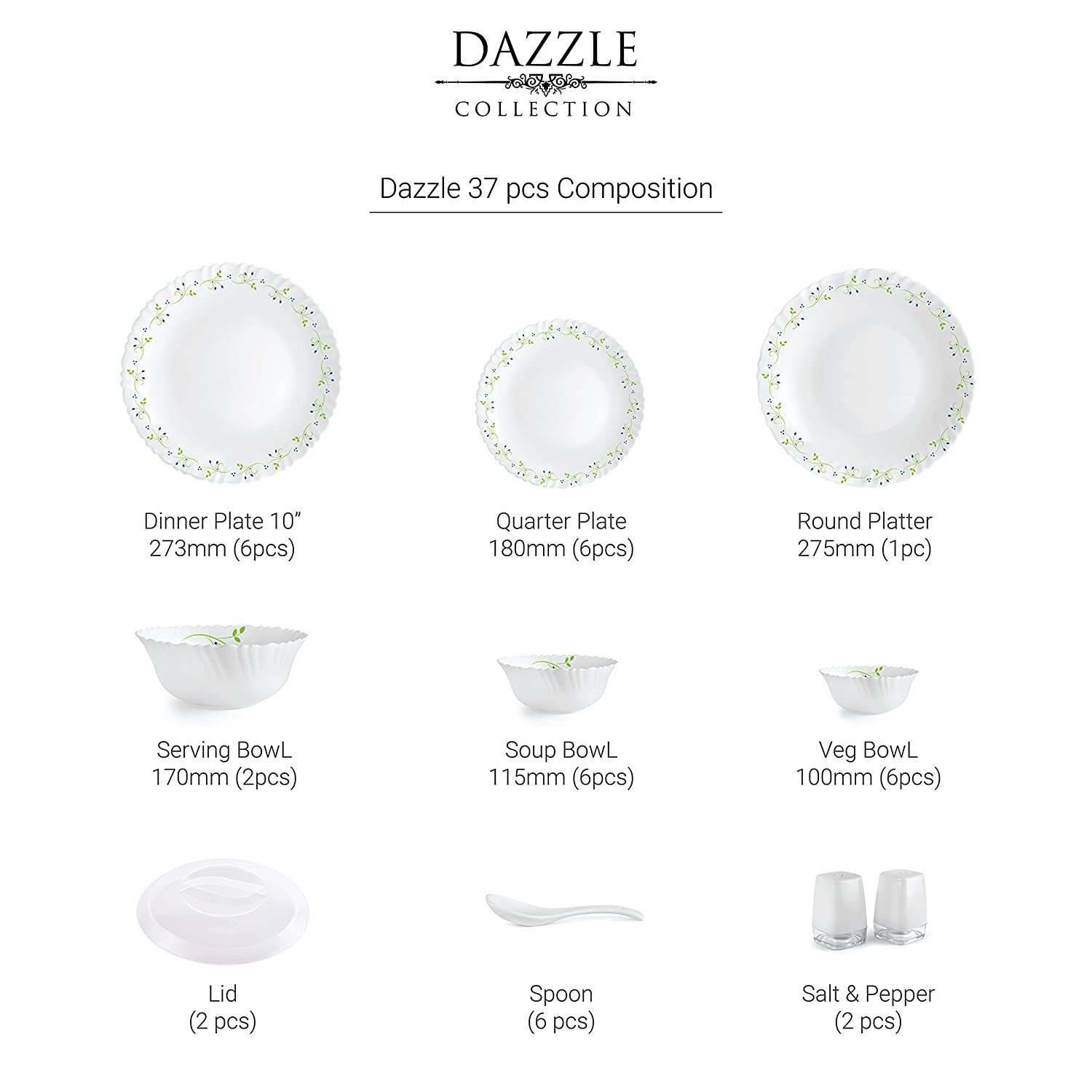 Pack Content: 6 Dinner Plates, 6 Quarter Plates, 6 Veg Bowls , 6 Soup Bowls, 2 Serving Bowl , 2 Serving Bowls Plastic Lids 1 Rice Plate .6 Soup Spoons and 2 Salt Pepper Pot