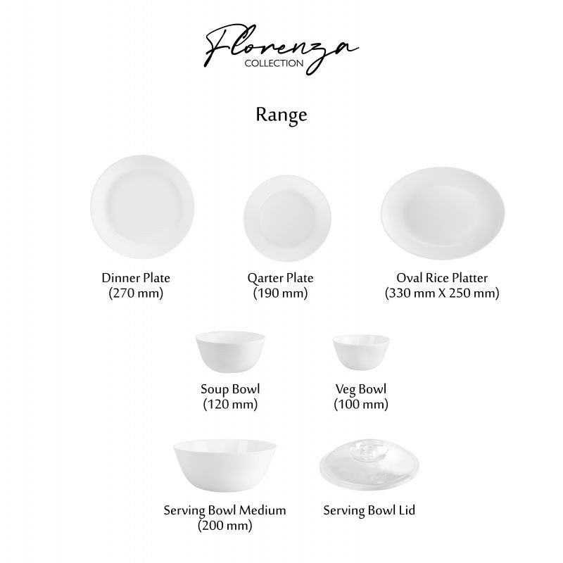 Diameter: Dinner Plate - 11 inch, Soup Bowl-4.7 inch, Quarter Plate - 7.9 inch, Veg Bowl - 4 inch, Serving Bowl - 7.9 inch, Oval Platter - 13 x 10 inch