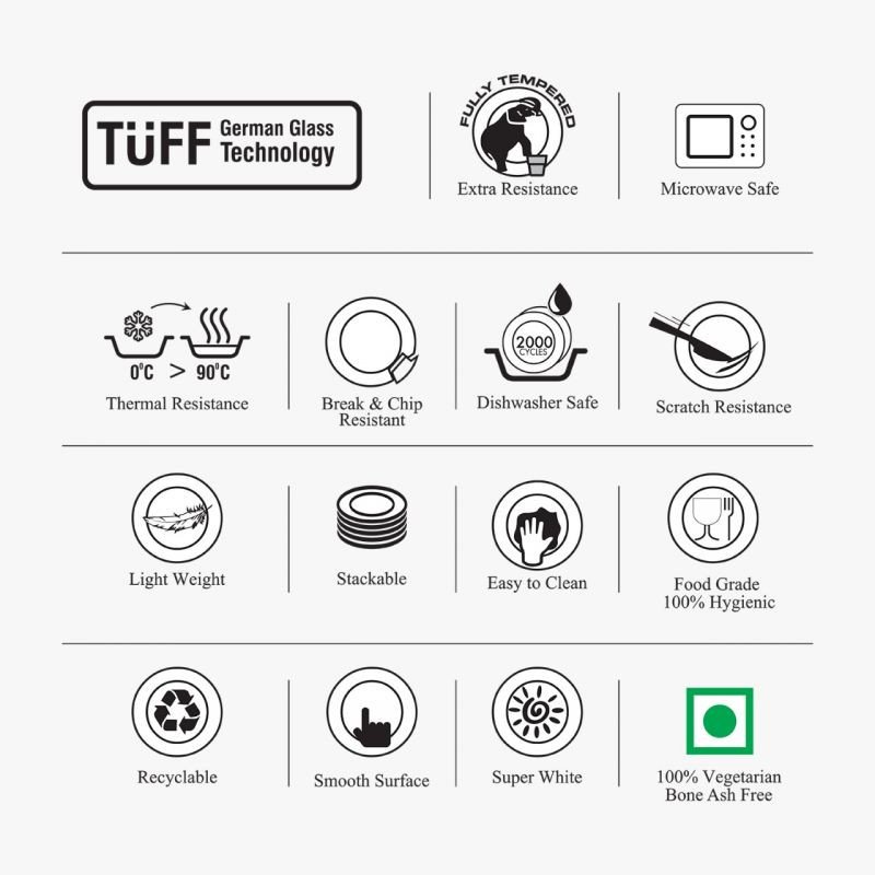 Tuff German glass technology, Break & chip resistant, Extra strong, Thermal resistance 0 degree > 90 degree, Scratch resistant,