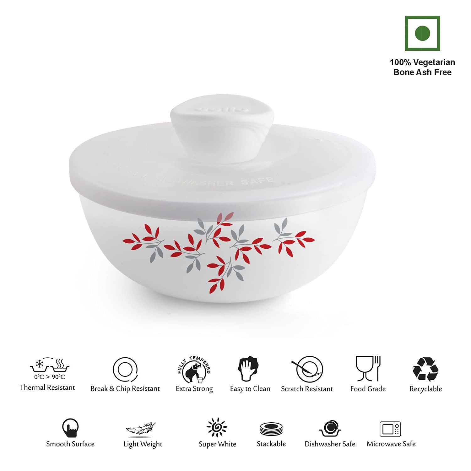100 percent vegetarian, bone ash free and made of green material. Vibrant prints on smooth super white surfaces create dazzling lightweight dinnerware.