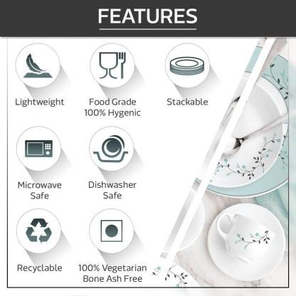 Products are Thermal Resistant, Extra Strong 3X Fully Tempered, Break & Chip Resistant, Easy to Clean, Smooth Surface, Super White, Scratch Resistant, Light Weight, Stackable, Dishwasher Safe, Microwave Safe, Food Grade 100 % Hygienic, Recyclable, 100% Vegetarian Bone Ash Free.