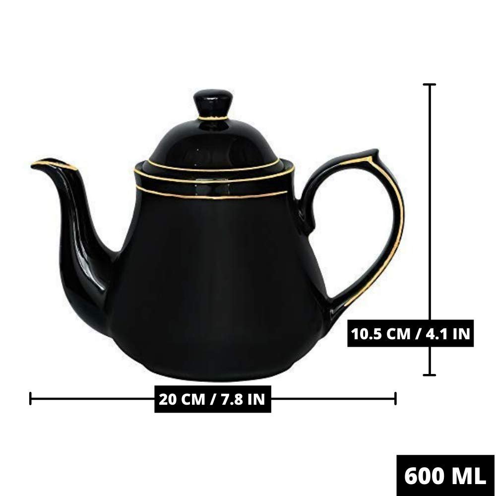 Femora Indian Ceramic Fine Bone China Gold Line Black Tea Kettle Tea Pot for Office, Home, 1pc, Serving for 3 Black