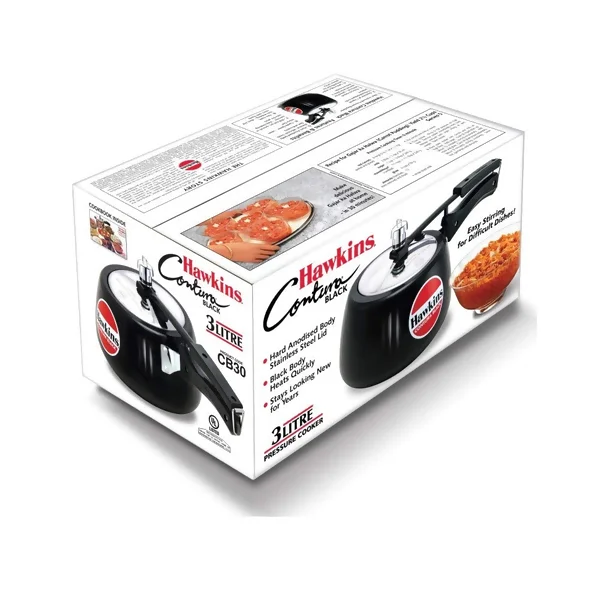 The beautiful, durable black finish given by 60 microns thick hard anodising has three benefits. It makes the pressure cooker absorb heat faster making it more energy-efficient. Your pressure cooker stays looking new for years. And the hard anodising surface reacts less with the acids and juices in the food.