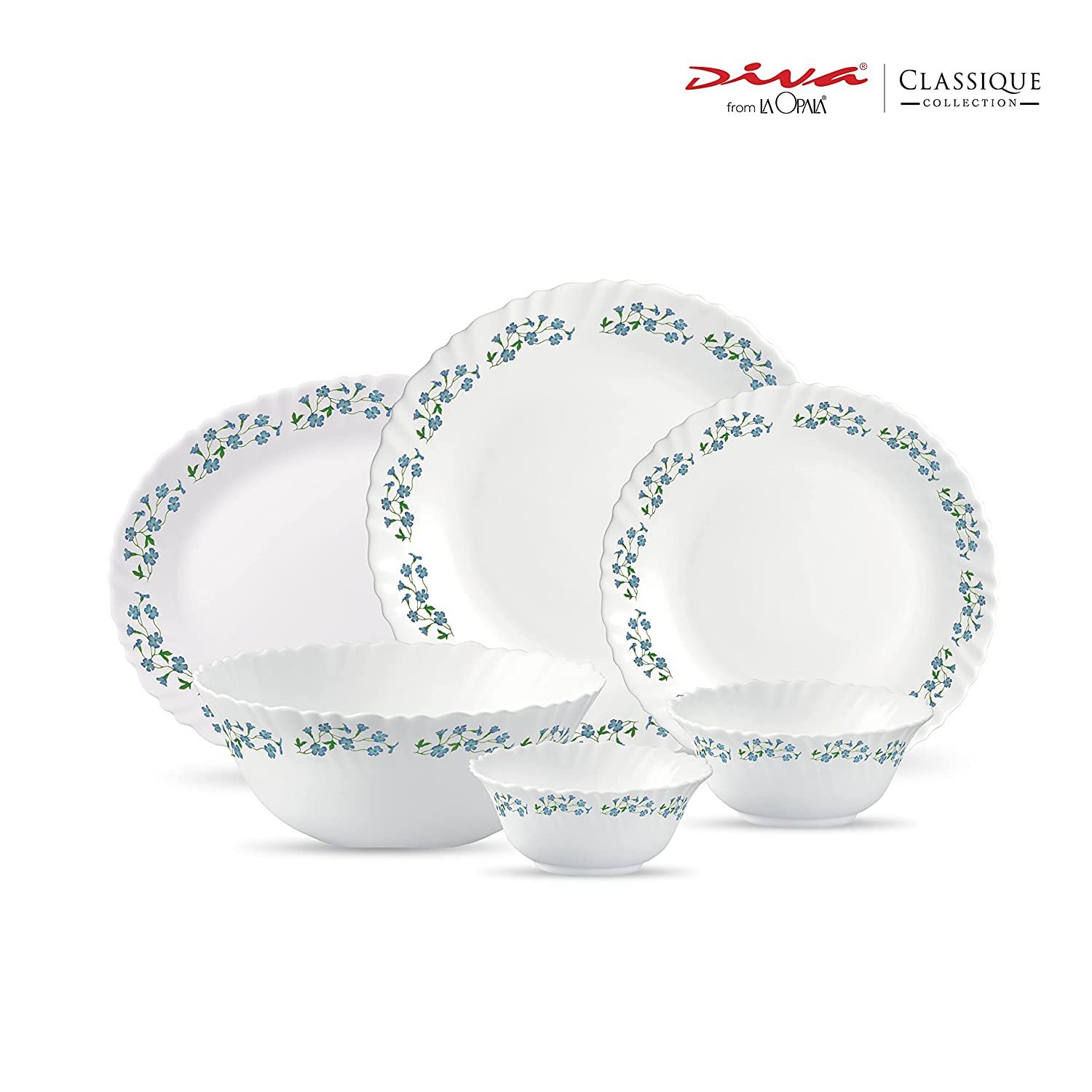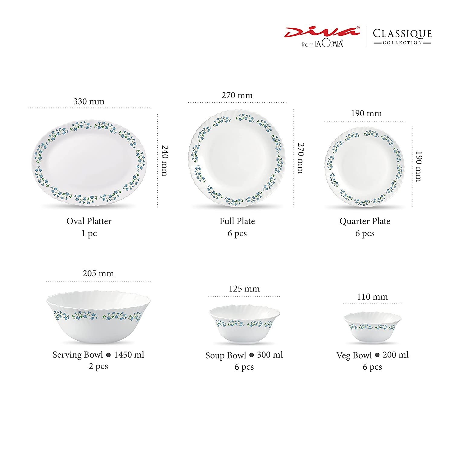 - Package Contents: 6N Full Plate (270 mm), 6N Quarter Plate (190 mm), 6N Veg Bowl (180 ml) , 6N Soup Bowl (340 ml),1N Oval Platter (330 mm), and 2N Serving Bowl (1450 ml)