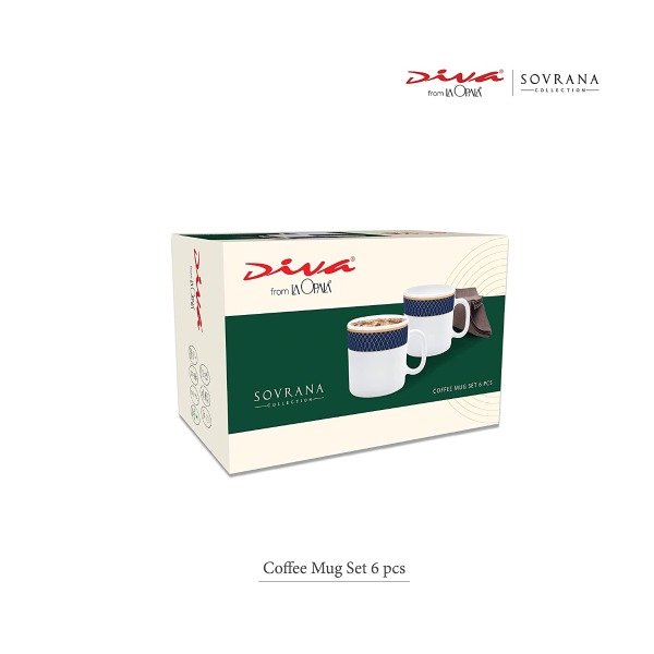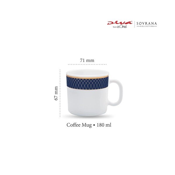 Introducing the La Opala Diva Sovrana Collection Opal Glass Coffee Mug Set in Regent Blue and White. This beautiful set of six coffee mugs is perfect for those who appreciate both style and function. Each mug has a capacity of 180 ml and is made from high-quality opal glass, which makes it heat-resistant, durable, and dishwasher-safe.