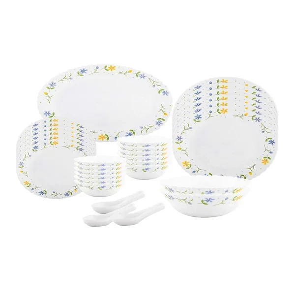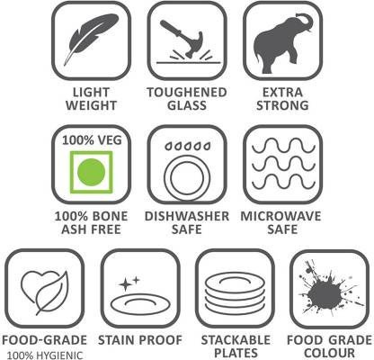 The stain resistant, non-porous and non-toxic material used in La Opala dinnerware makes it a durable and versatile set even for everyday or occasional use. Perfect in its simple design and lightweight nature for ease of use, this chip-resistant La Opala dinner set is a great buy This dinner set includes 6 Full Plates, 6 Quarter Plates, 6 Veg bowls, 6 Soup bowls , 6 Soup spoons, 2 Serving bowls, 2 Serving bowls cover and 1 Rice plate The LaOpala Dinner Set is resistant to thermal shock. So, even when you heat food in it using the microwave, it will last long while offering you hygiene and safety each time. It is FDA-approved and fade resistant to last you longer than ordinary dinner sets. The shiny opal glass finish and the pristine white colour together is sure to add a class to your table. Set your table in style with the dinner set and make the spread look more appealing. Make your everyday dining affair a special one with the Dinner set And serve food in an enticing manner.