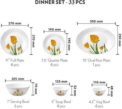 Diameter : Full Plate - 11 inch, Q Plate - 7.5 inch, Veg. Bowl - 4 inches, Soup Bowl -4.5 inch, Serving Bowl - 8 inches, RICE PLATE 12 inch