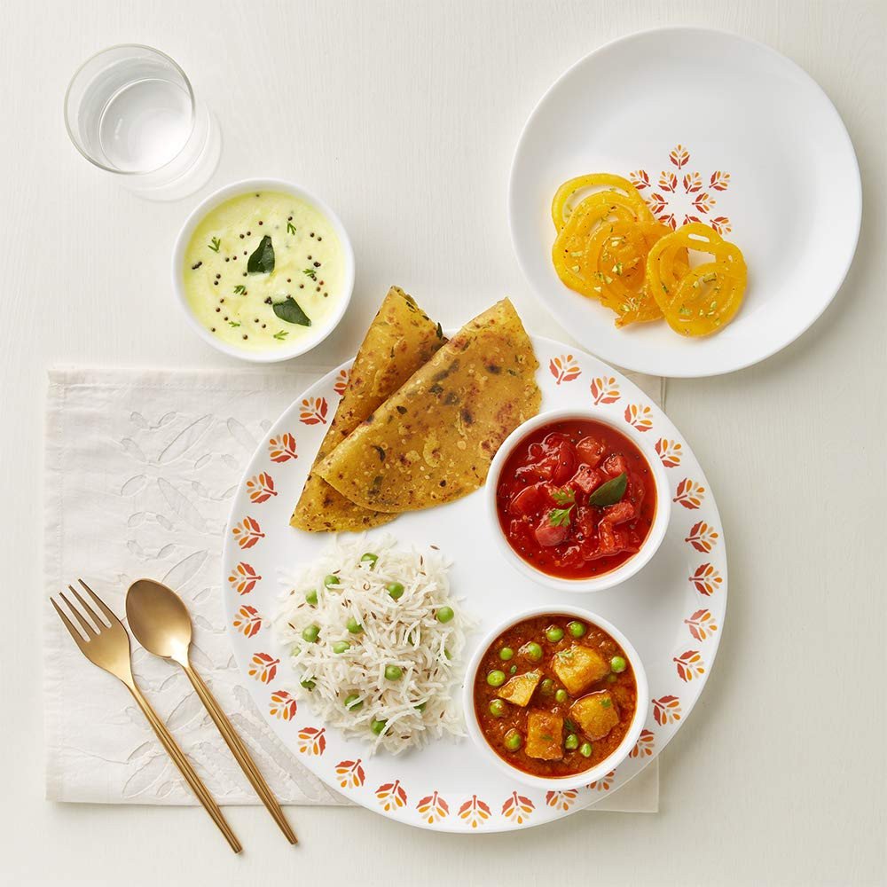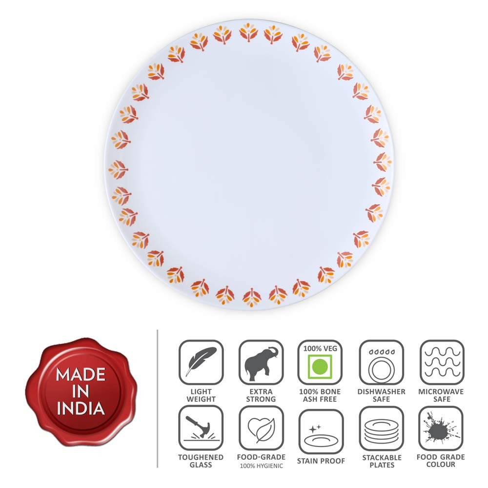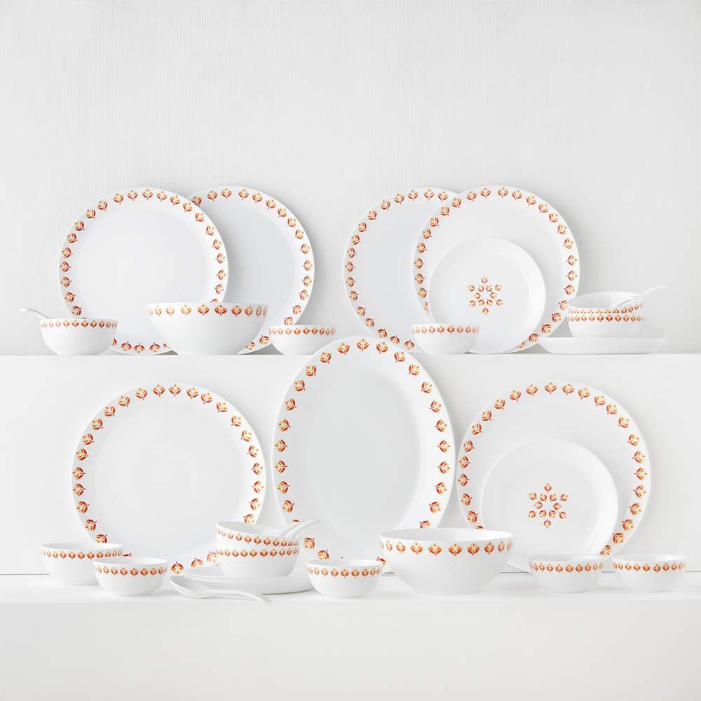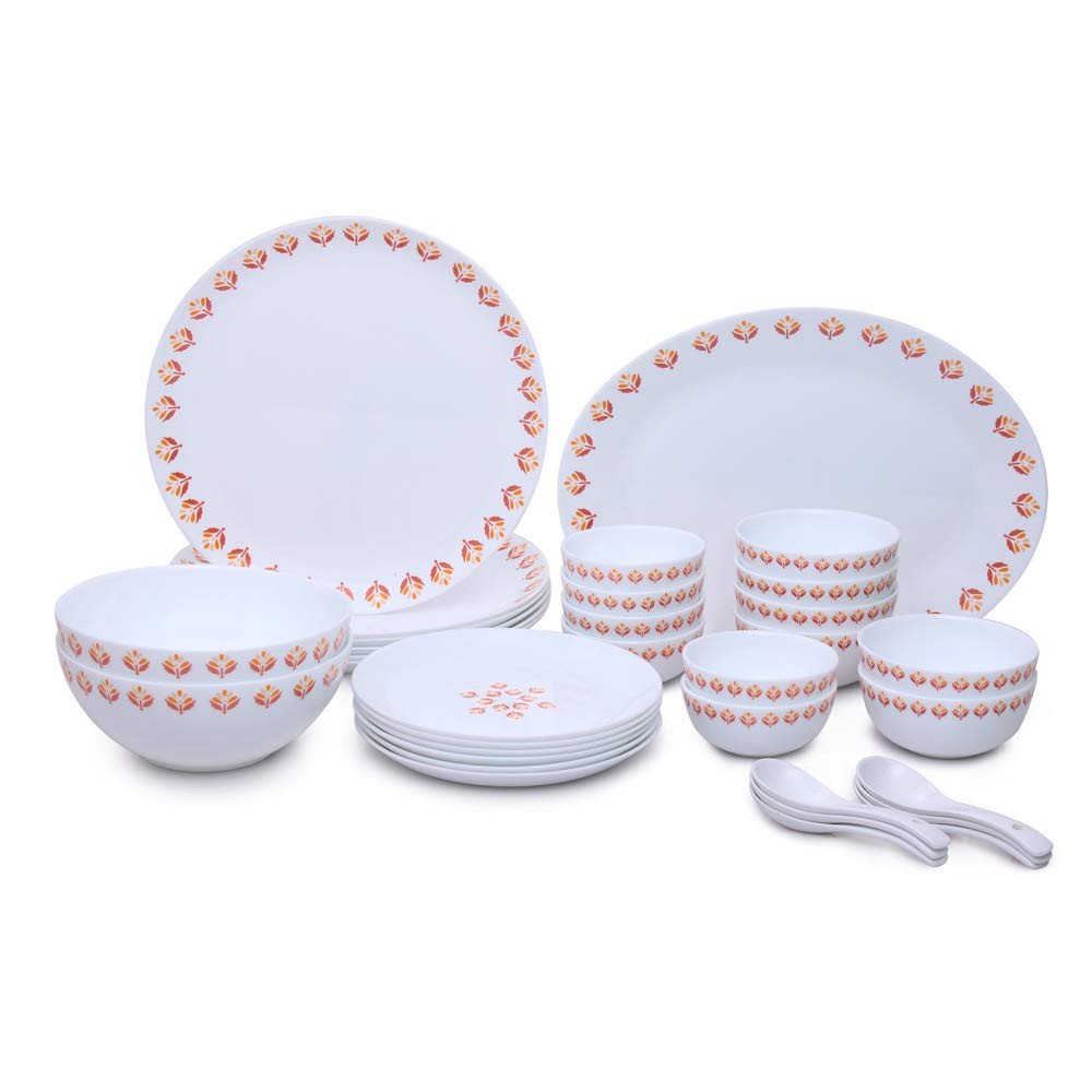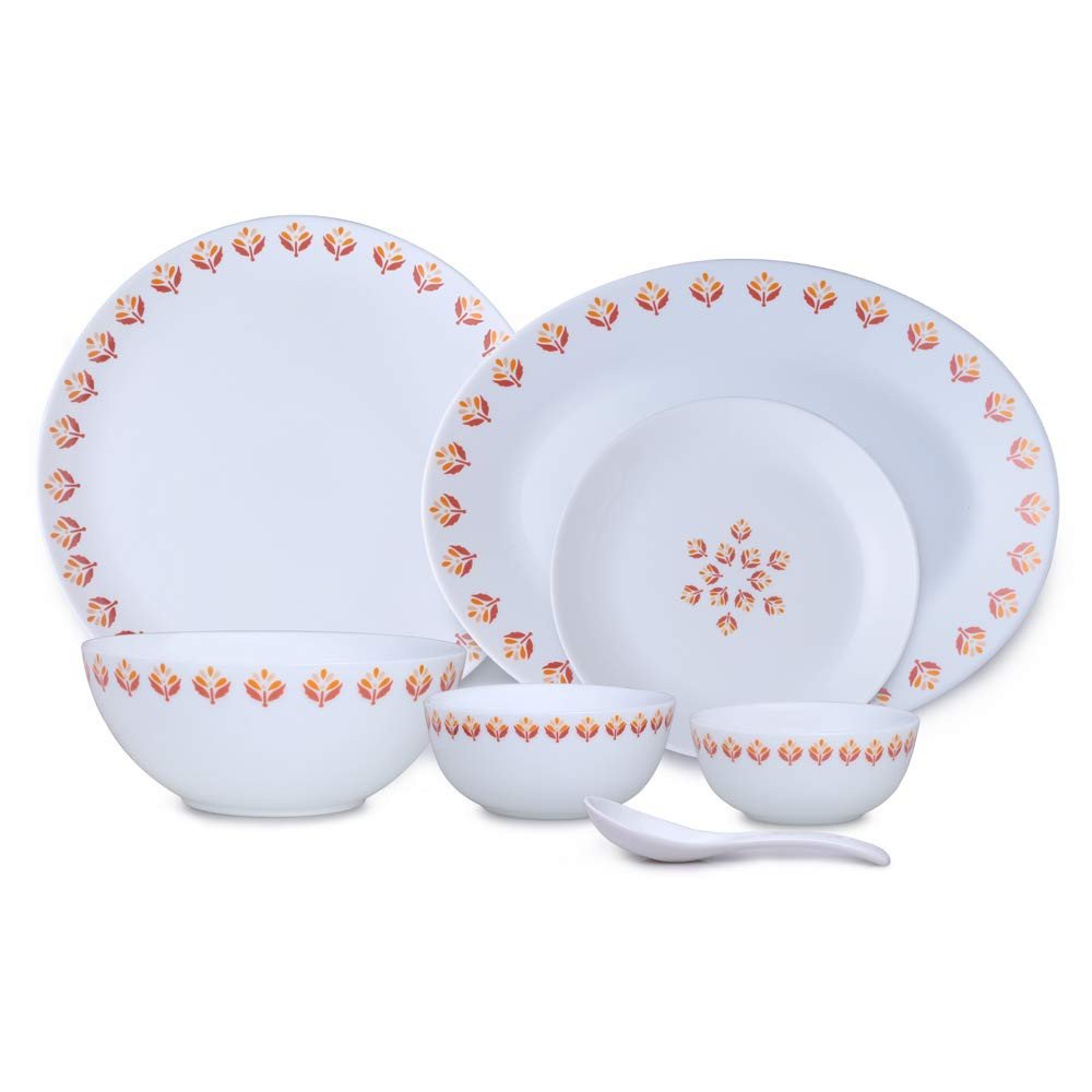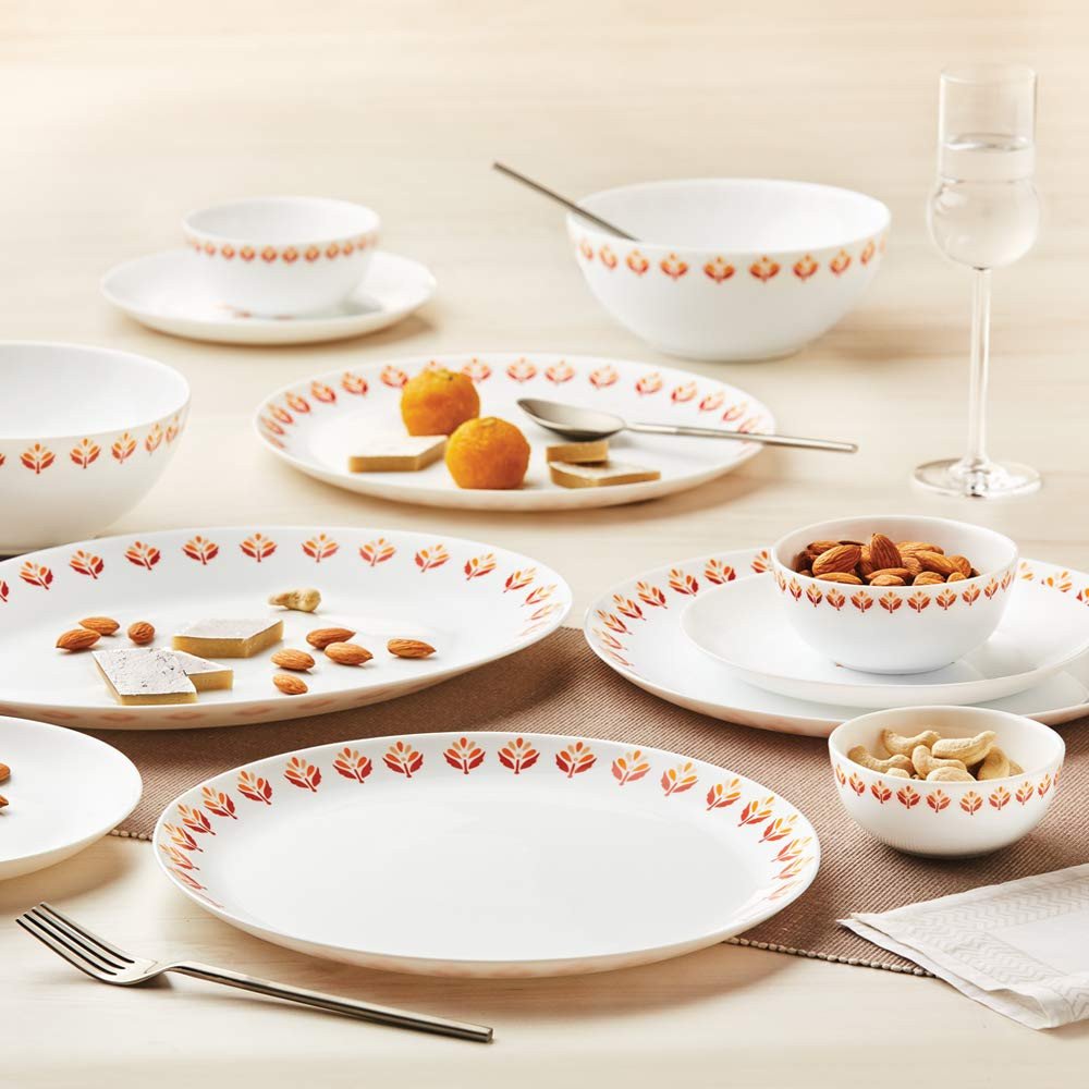 Included Components : 6-Piece 11'' Full Plates, 6-Piece 7'' Quarter Plates, 1-Piece Rice Plate, 2-Piece 7 inch Serving Bowls, 6-Piece 5 inch Soup Bowls, 6-Piece 4.5 inch Veg Bowls, 6-Piece Spoons
