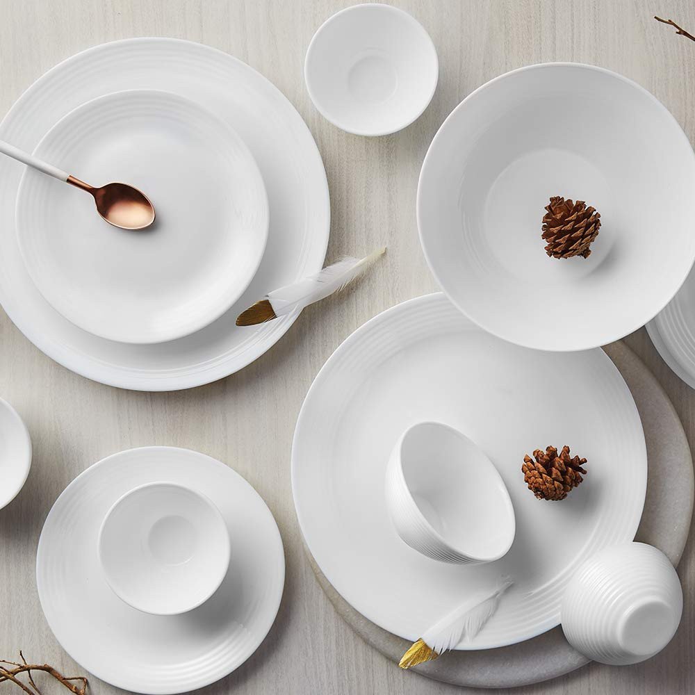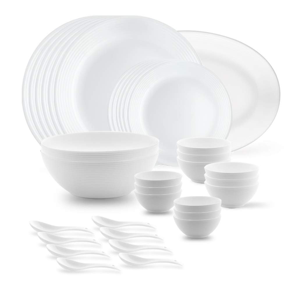 Package Contents: 6-Piece 11'' Full Plates, 6-Piece 7'' Quarter Plates, 1-Piece Rice Plate, 2-Piece 8" Serving Bowls, 6-Piece 5" Soup Bowls, 6-Piece 4.5" Veg Bowls, 6-Piece Spoons