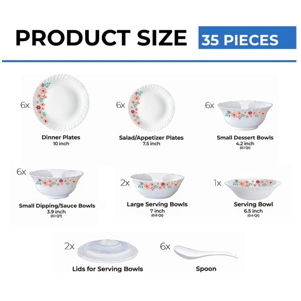 The Larah by Borosil Ayana Silk Series Opalware Dinner Set includes 6 full plates, 6 quarter plates, 6 vegetable bowls, 6 soup bowls, 6 soup spoons, and 1 serving bowl. Each piece features a stylish design that is sure to add charm to your dining table.