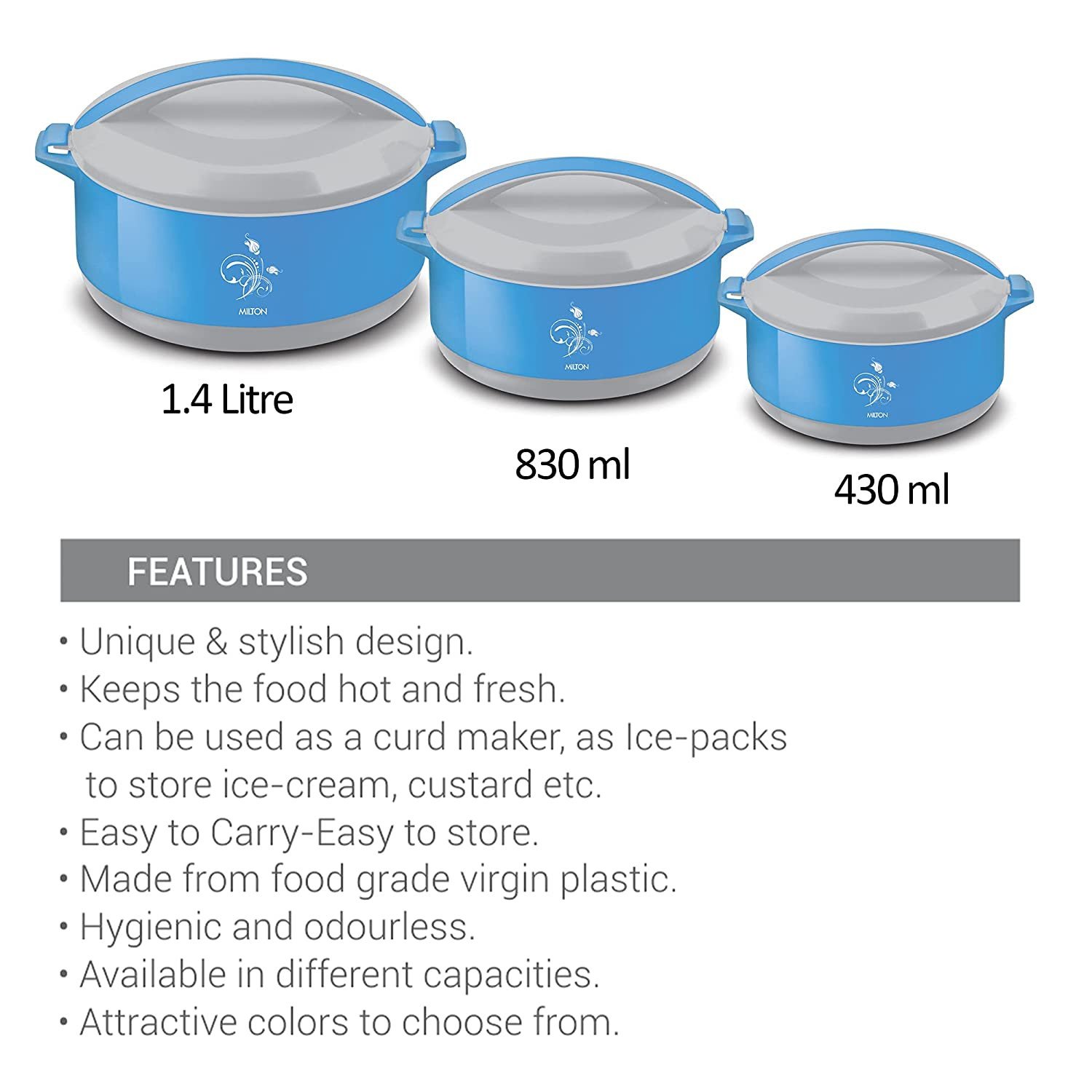 Included Components : 3 - Pieces Divine Jr Gift Set (430 ml, 830 ml, 1400 ml)
