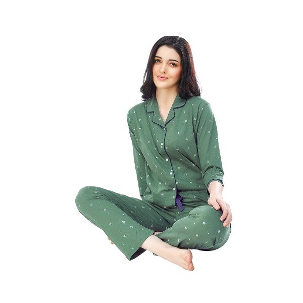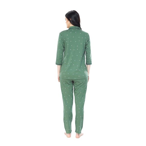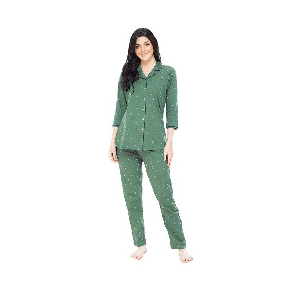 Upgrade your sleepwear collection with this stylish and comfortable Women's Green Cotton Star & Dot Printed Night Suit Set. The high-quality cotton material ensures a soft and comfortable feel, while the stylish star and dot print design in beautiful shades of green add a touch of elegance to your nightwear. The set includes a full-sleeve shirt with button closure and a matching pyjama with an elastic waistband for a snug fit. The lightweight and breathable fabric is perfect for a comfortable night's sleep, making it ideal for both summer and winter seasons. The shirt has a classic collar and a front pocket for added convenience. It is easy to wash and maintain, retaining its softness and color even after multiple washes. Whether you're lounging at home or looking for a stylish nightwear option, this Women's Green Cotton Star & Dot Printed Night Suit Set is the perfect choice. Shop now and experience the comfort and style of this exquisite nightwear set.