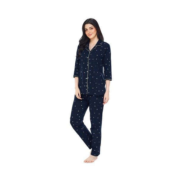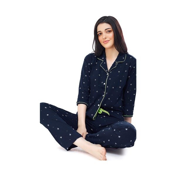 Upgrade your sleepwear collection with our Women's Cotton Star & Dot Printed Night Suit Set of Shirt & Pyjama and experience comfort and style like never before!