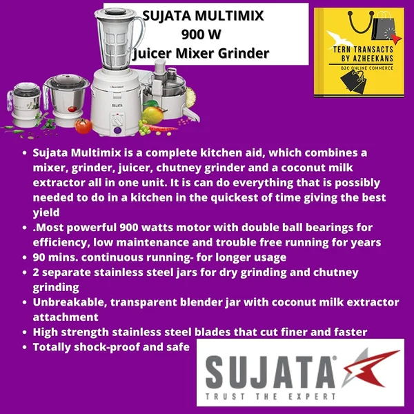 Includes: 1 unit Motor, 1 Jucier attachment, 1 Blender jar, 1 Dry Grinder jar, 1 Chutney jar