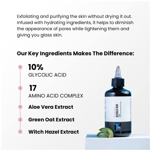 • USAGE INSTRUCTIONS: We recommend using this even glow toner at night time. Cleanse your face properly with our recommended True Therapy Cleanser, followed by pouring a small amount of this glycolic acid toner on a cotton pad and gently wiping over your face, neck and chest while avoiding near the eyes. Apply serum or moisturiser afterwards. For best results, use it a maximum of three times a week over your face skin.