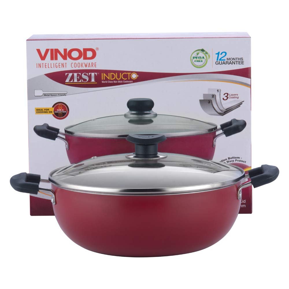 Vinod Hard Anodised Cookware is designed with thick body which helps even heat distribution and makes the cookware long lasting and durable. It?? new improved coating makes the cookware durable and poses no harm to food. The beautiful, durable black finish which is hard anodised has two benefits i.e., it makes the cookware absorb heat faster, making it more energy efficient and the cookware stays looking the same for years. This cookware has sturdy riveted handles for better grip and it comes with tempered glass lid which allows you to see through the cooking process. This is both gas stove and induction compatible