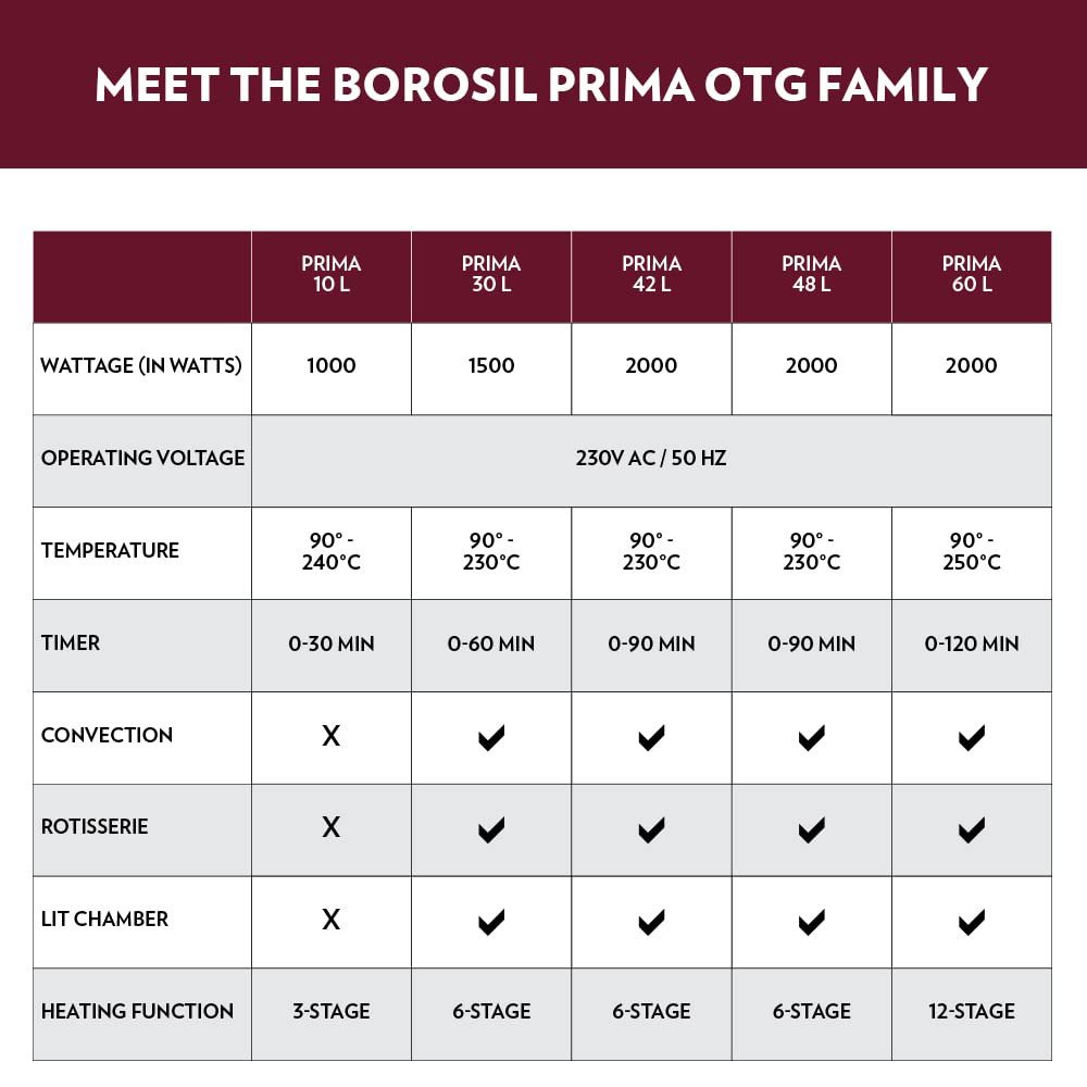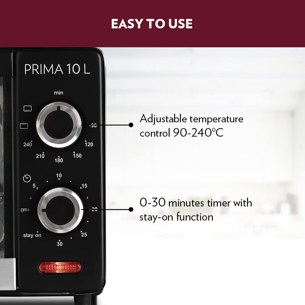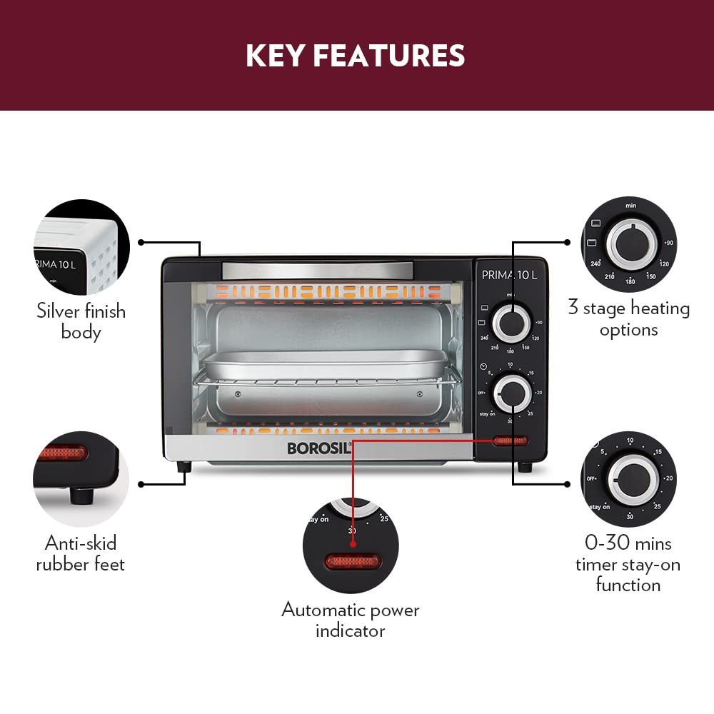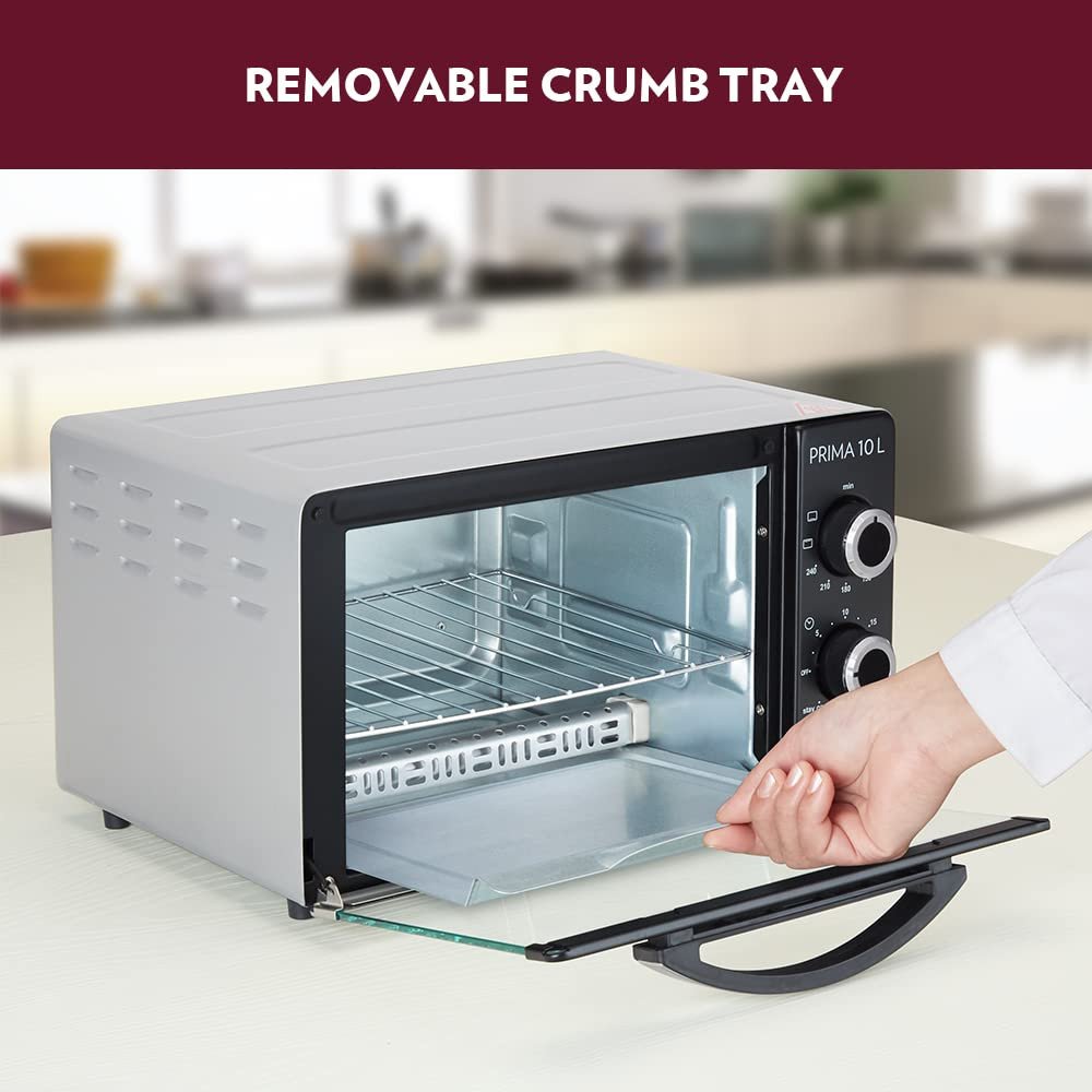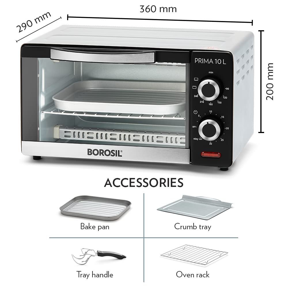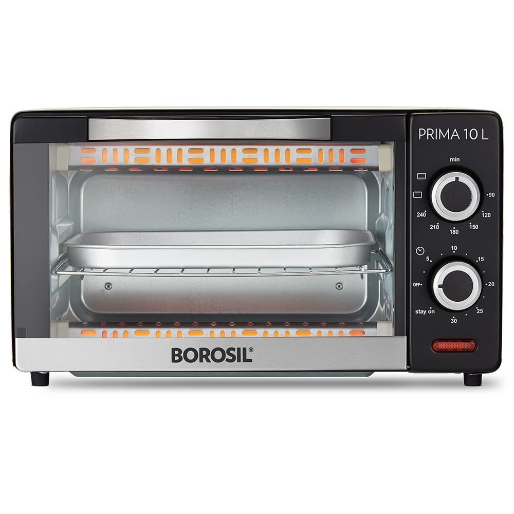 - Functions include baking, toasting and grilling in Borosil Prima 10 Oven Toaster Griller