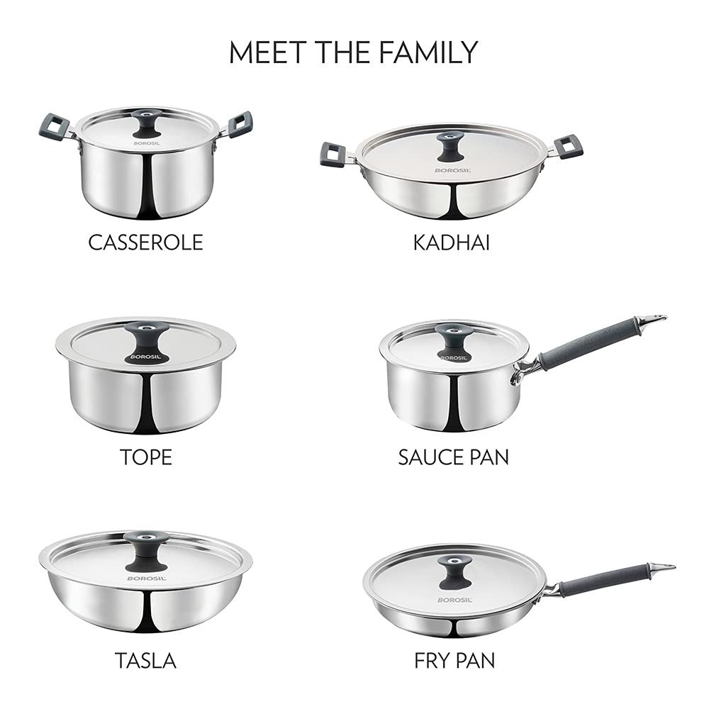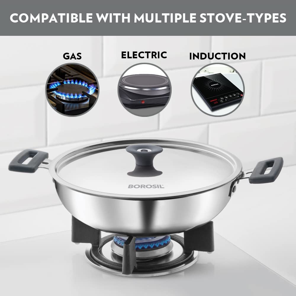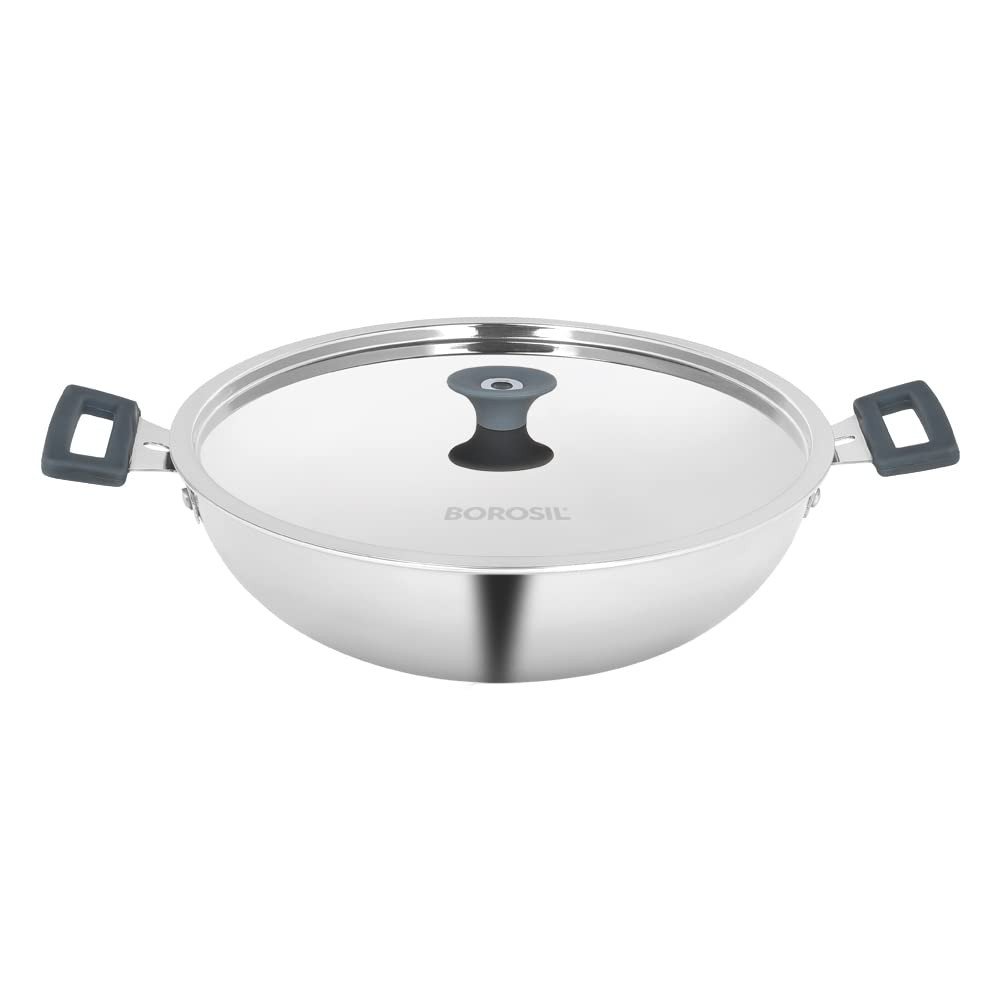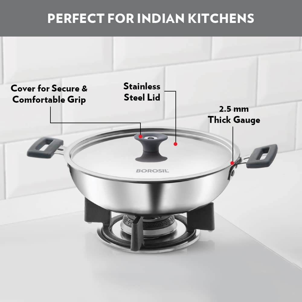 - FOOD GRADE SS-304 STAINLESS STEEL KADHAI - Whether you're an amateur cook or a pro, you'll appreciate the versatility this stainless steel kadai brings to your kitchen. The Borosil stainless steel induction kadai with lid can be used to fry puris, samosas or simmer dals, subzis and curries. The lid catches any oil spits so it's great for large batch, long hours cooking activities. The heavy gauge stainless steel also makes the vessel durable and long-lasting.