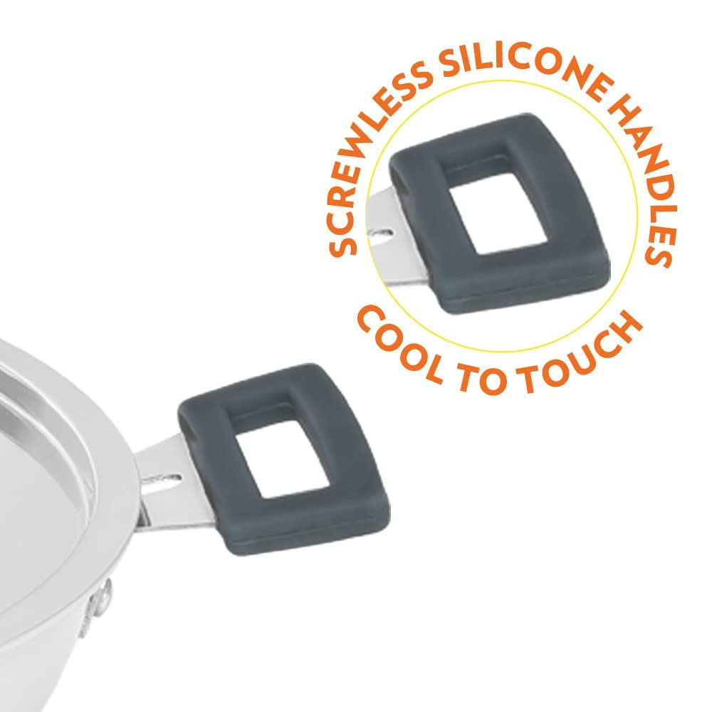- HAS SILICONE HANDLES, COOL TO TOUCH - The best thing about this induction cookware is that it comes with silicone handles. These especially designed handles do not disintegrate with repeated use nor do they heat up while cooking. The tri-ply kadhai is stick-resistant & dishwasher safe.
