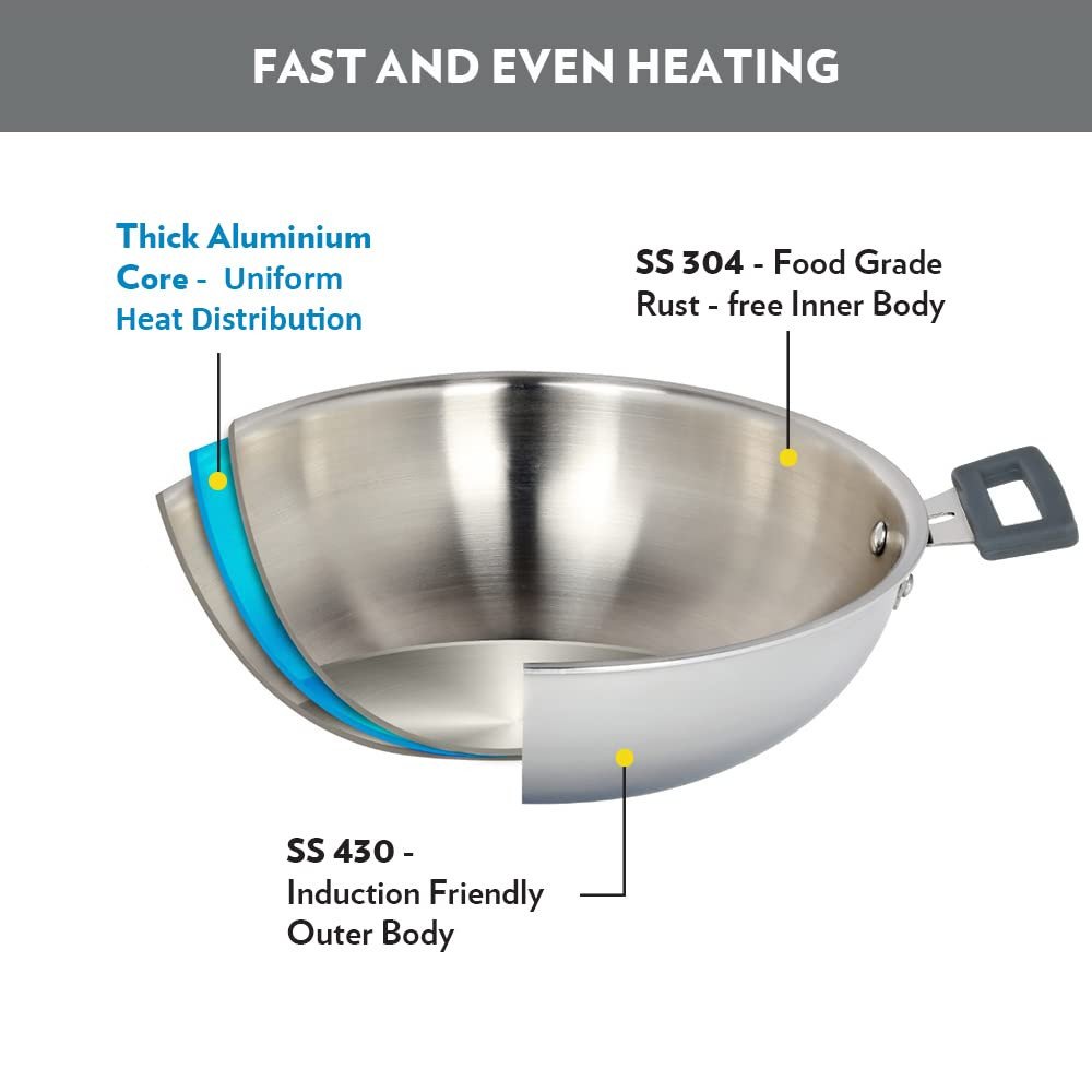 - TRI-PLY BODY FOR UNIFORM HEATING - The tri-ply base helps the kadhai with lid to heat quickly and allows heat to be evenly distributed providing a smooth and flawless cooking experience.