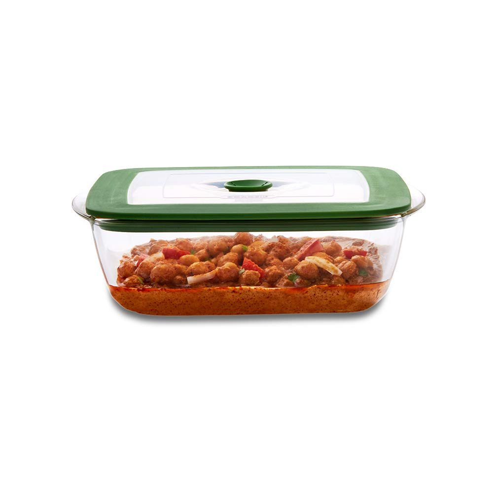 Now bake, serve, store, reheat - all in the same dish! Great for pulaos, lasagnas, pastas, macaronis, kebabs, cakes, breads - these dishes can be used to cook whatever you feel like. The special airtight seal keeps the food fresh when stored in the fridge and does not allow any smell to enter or exit. The lid can be used to reheat for up to 30 seconds in the microwave with the knob up to allow for steam release. When serving, put the Borosil Square Dish with Green Lid: