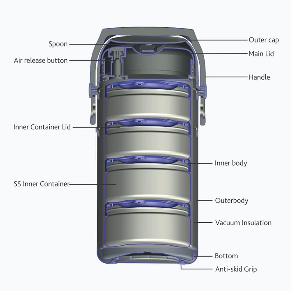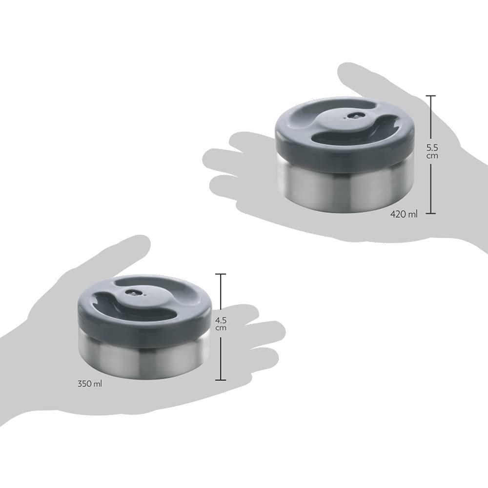 Material type: Stainless Steel; No. of containers: 4; Capacity of containers: 2 Containers: 350ml Each + 2 Containers: 420ml Each; Contents include: 2 Containers (420ml), 2 Containers (350ml) With Lids, Foldable Spoon, Lunch Bag; Colour: Silver