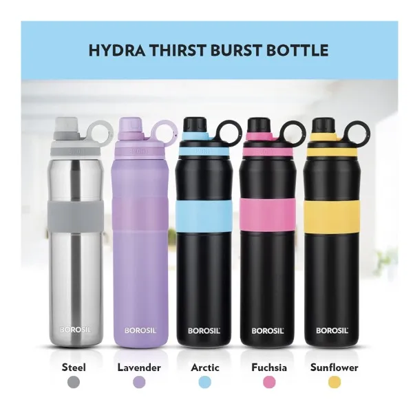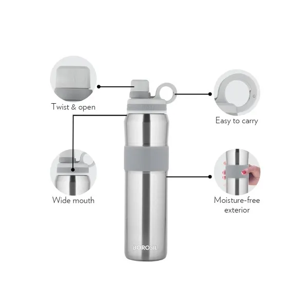 Borosil Hydra Thirst Burst Steel Water Bottle, Stainless Steel Water Bottles, Vacuum Insulated Flask Bottles, 800 ml, Grey Steel