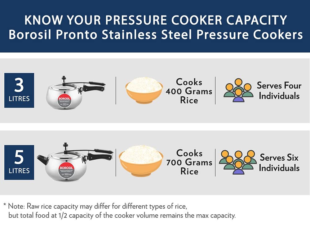 THE PERFECT SIZE: The 3L works great if you're preparing a meal just for yourself or for 2-4 individuals. It can easily accomodate up to 400gms of plain rice and 150 gms of tuvar dal. The 5L stainless steel cooker can cook up to 900 gms of plain rice and 350 gms of tuvar dal, making it perfect if you're hosting a small group of friends or family.