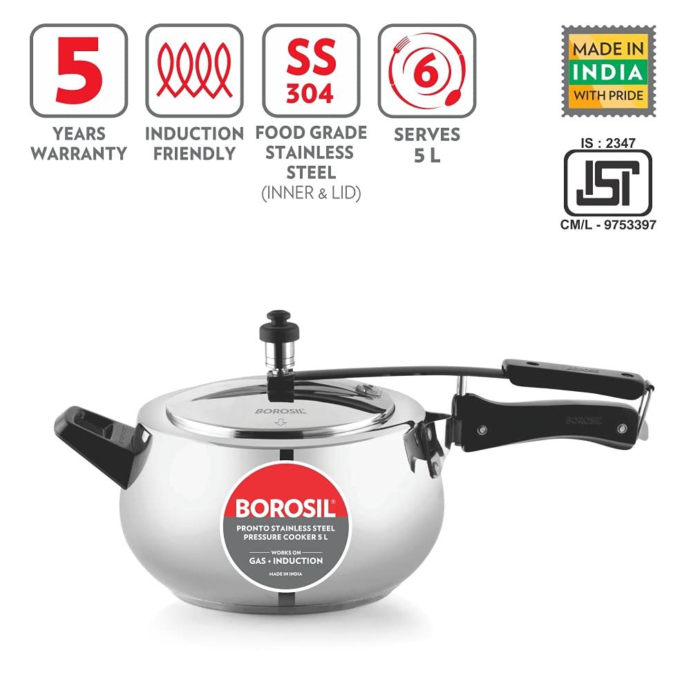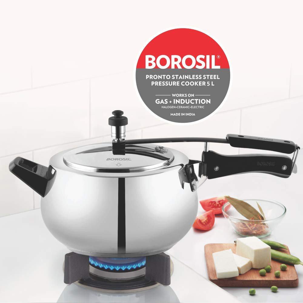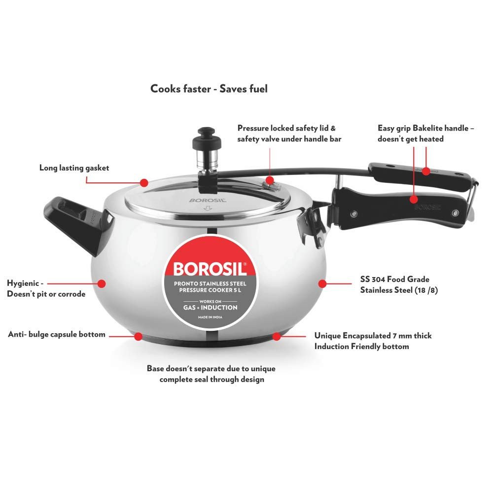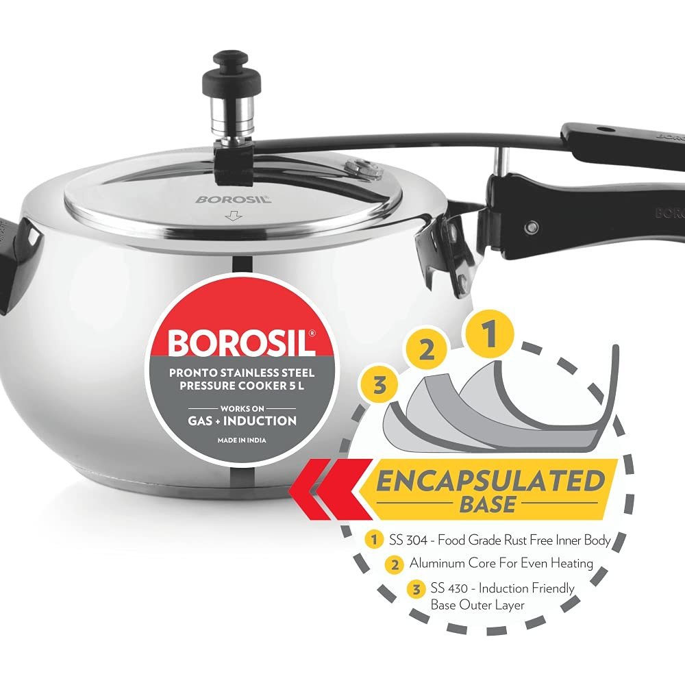 COOKS EFFORTLESSLY: Wave goodbye to long hours in the kitchen! Borosil Pronto stainless steel pressure cookers are designed to reduce cooking time so that even grandma's slow-cook recipes are ready in a few whistles. The unique 7mm thick base transfers heat uniformly and more quickly than regular cookers. This effectively reduces cooking time and saves energy too.