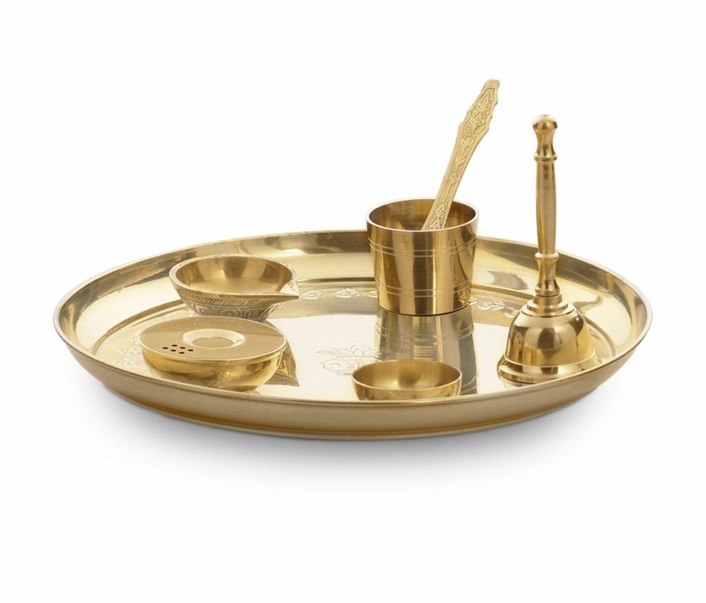 The Thali pack comprises of a Diya, a Bell, a Roli/Kumkumkatori, a Dhoop and Agarbatti holder, a Panchamrut set with a spoon and essential Pujan Samagri.