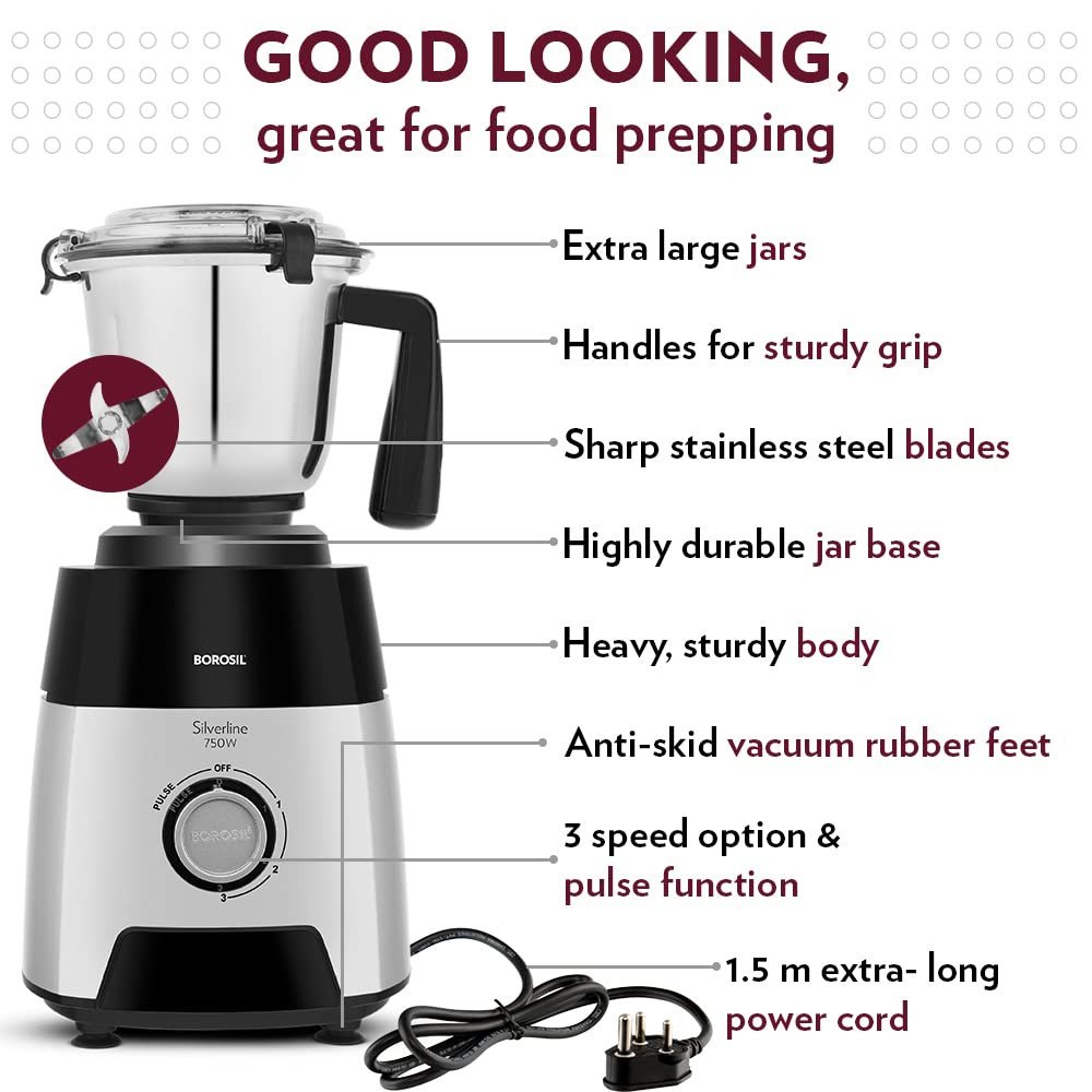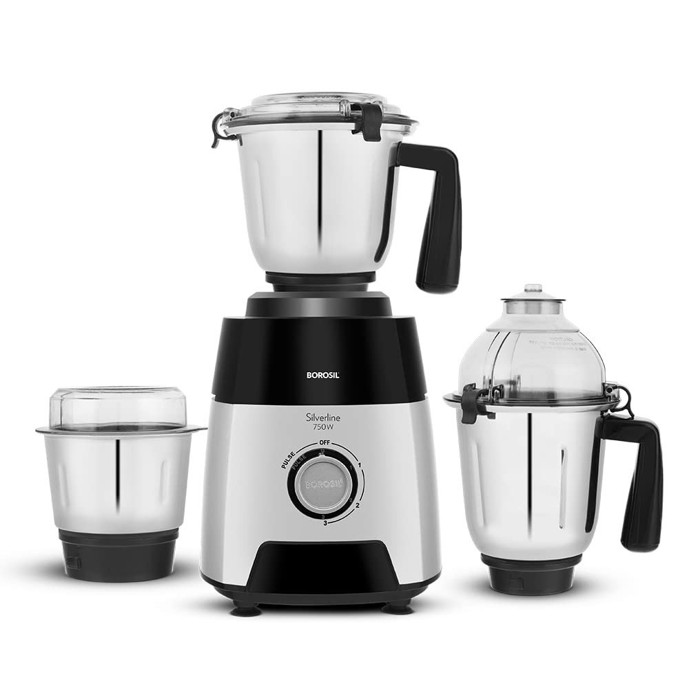 - STRONG BLADES - Equipped with a 750 watt motor, the Borosil mixer grinder easily grinds or pulverises the hardest of ingredients. This set consists of three jars with unbreakable lids- 1.5 L Blending Jar with Clip Locking mechanism for hands free operation, 1.2 L Dry / Wet Chutney Grinder with Clip Locking mechanism for hands free operation and 400 ml Chutney / Masala Grinder with Push Locking mechanism.