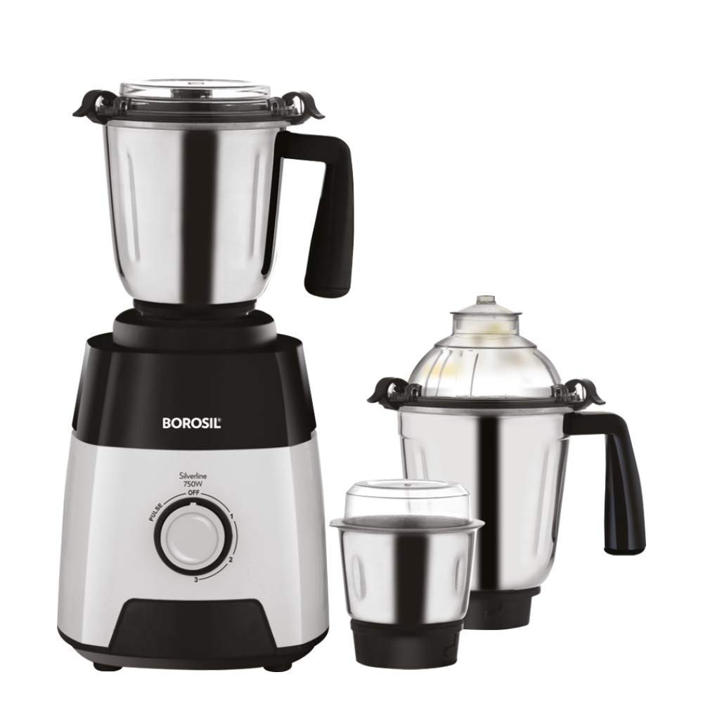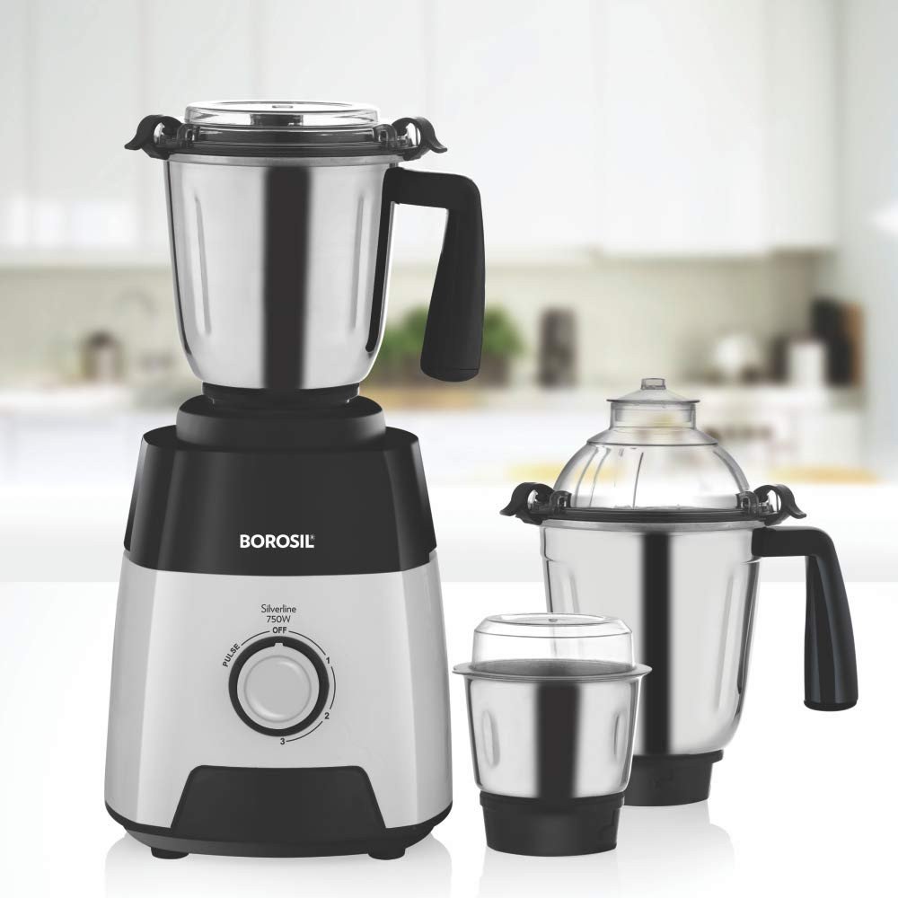 Our top of the line Mixer Grinder, the Borosil Silverline mixer grinder is a proprietary design which adds sleekness and elegance to your kitchen along with high performance. With 3 food grade stainless steel heavy jars for blending, dry/wet grinding and chutneys, the Silverline Mixer takes care of every mixing and blending need. Designed keeping in mind the Indian kitchen, the power cord is 1.8m long so that you can move the mixer around with ease. The body is made of 2.5 mm thick material as opposed to the standard 2.2 mm for a longer life because we know that once the Silverline becomes a part of your life, you just won't stop using it.