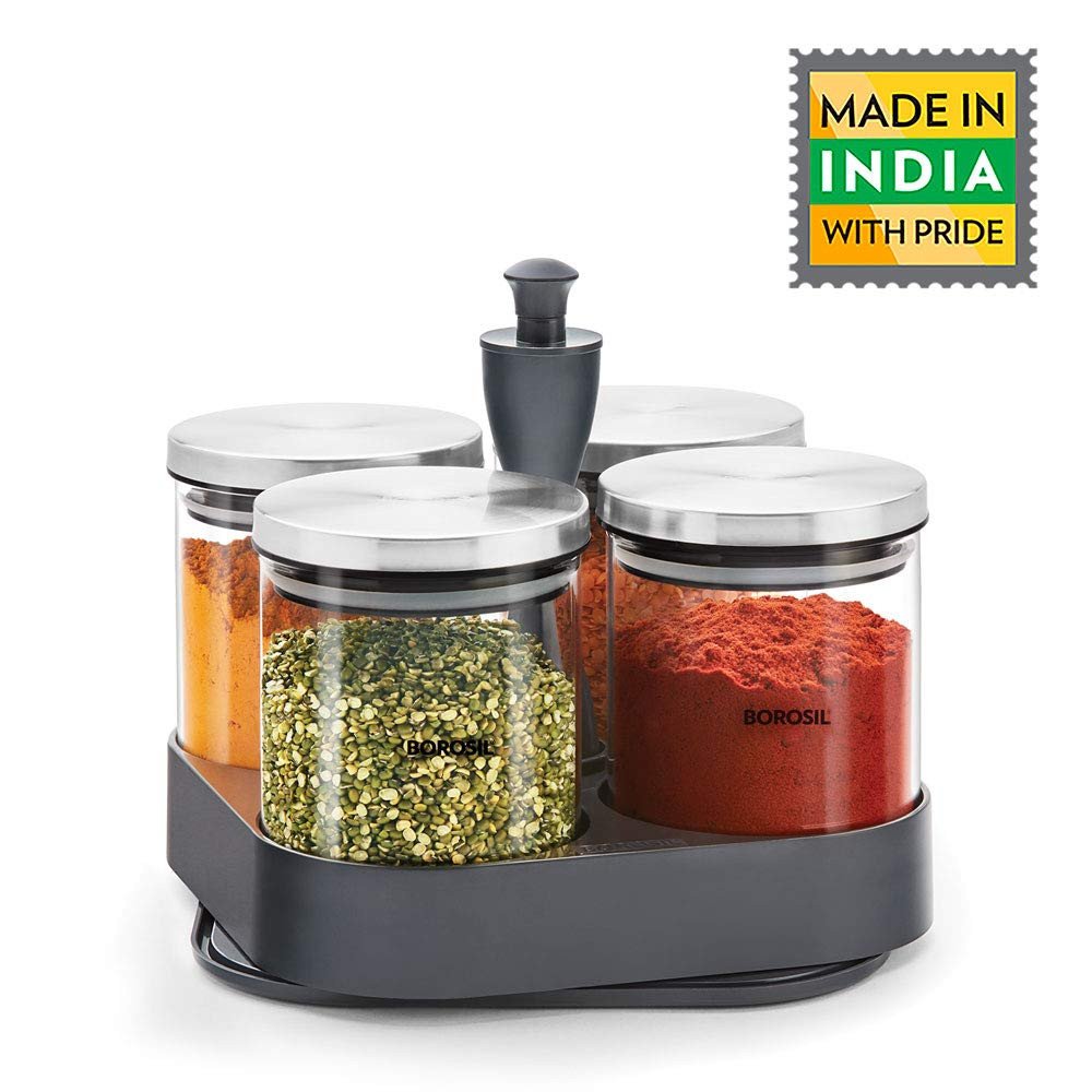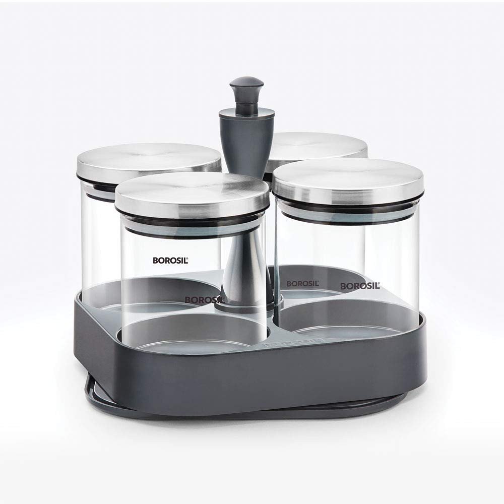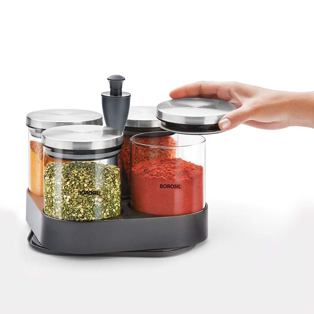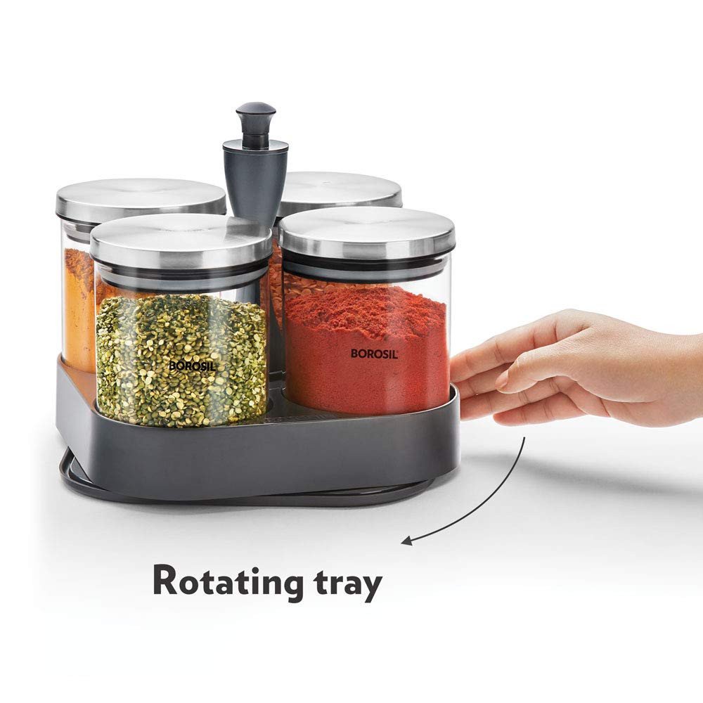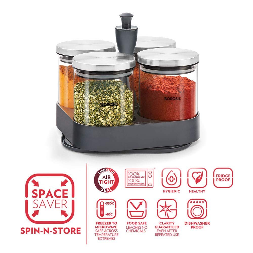 The Spin N Store unit is a revolutionary patented design by Borosil. It has two layers, both of which spin, allowing you to access the storage jars on each level with ease. The smooth mechanism revolves with the touch of a hand. The unit takes up very little space on your shelf or kitchen counter, allowing for efficient, convenient and easy storage. As always, all our products are designed to perform beautifully, just like you - and the Spin N Store is the perfect example of that!