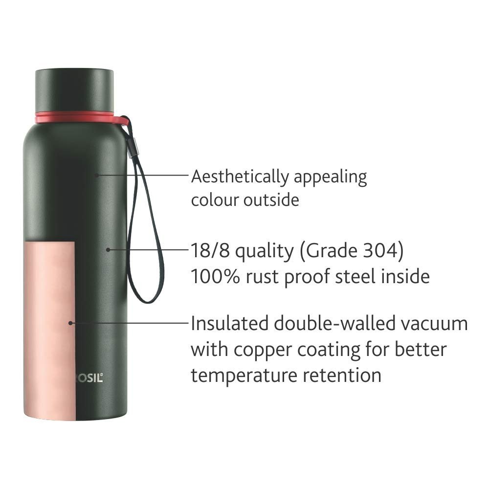 • Insulated double wall vacuum with copper coating for maximum temperature retention, non leaching and toxin free for healthy drinking