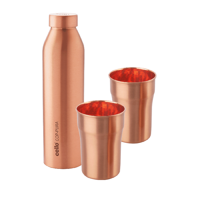 The Cello Copper Water Bottle and 2 Glass Moksh Gift Set are perfect for anyone who values health and wellness. Made from high-quality copper, the water bottle has natural anti-bacterial properties that make it perfect for storing and drinking water. Copper also helps to regulate the body's pH balance, aiding in digestion and immunity. The set includes two glass mugs that are perfect for drinking tea, coffee, or any other beverage. The glasses are made from high-quality, non-toxic glass, making them safe for daily use. The set comes in an elegant packaging that makes it a perfect gift for loved ones.