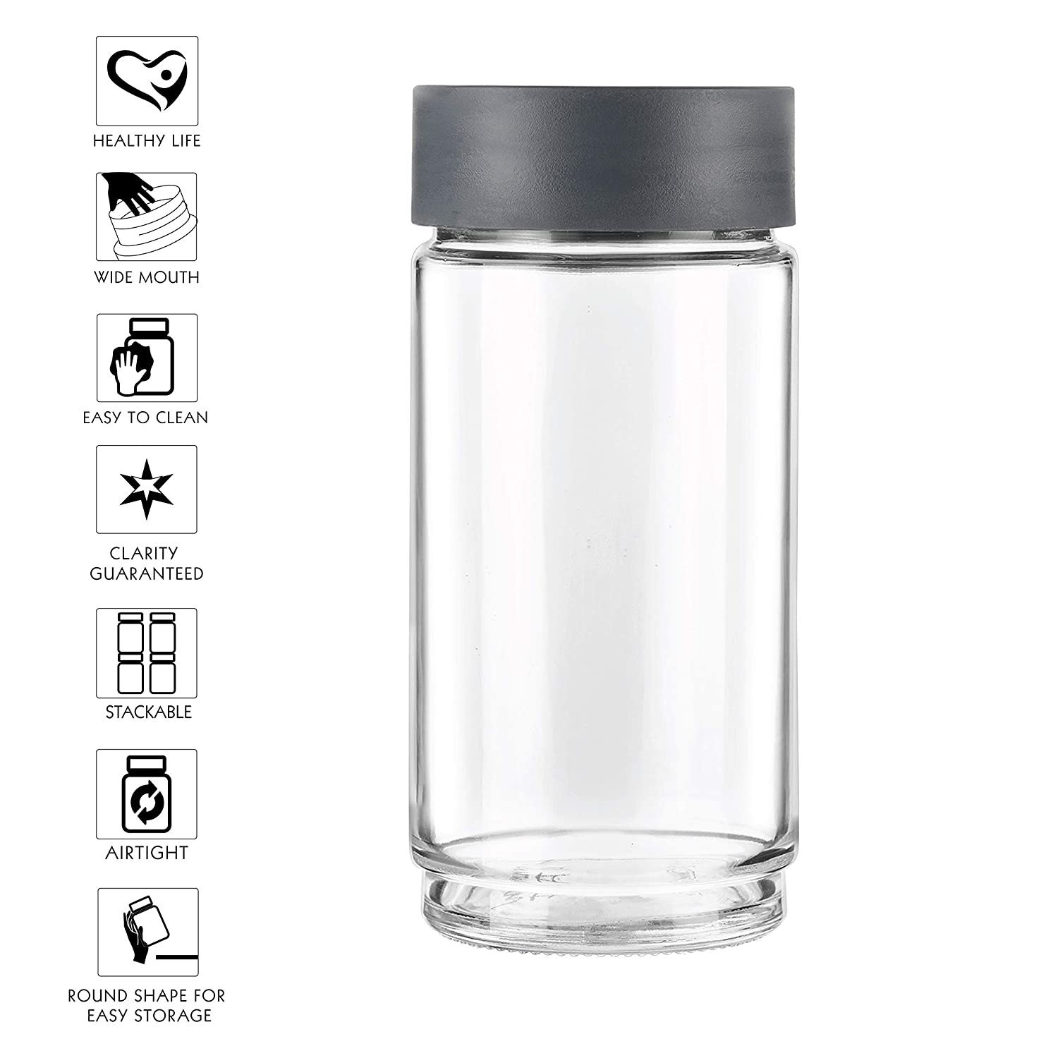 - Stackable jars with non slip rim on the unbreakable plastic lids.