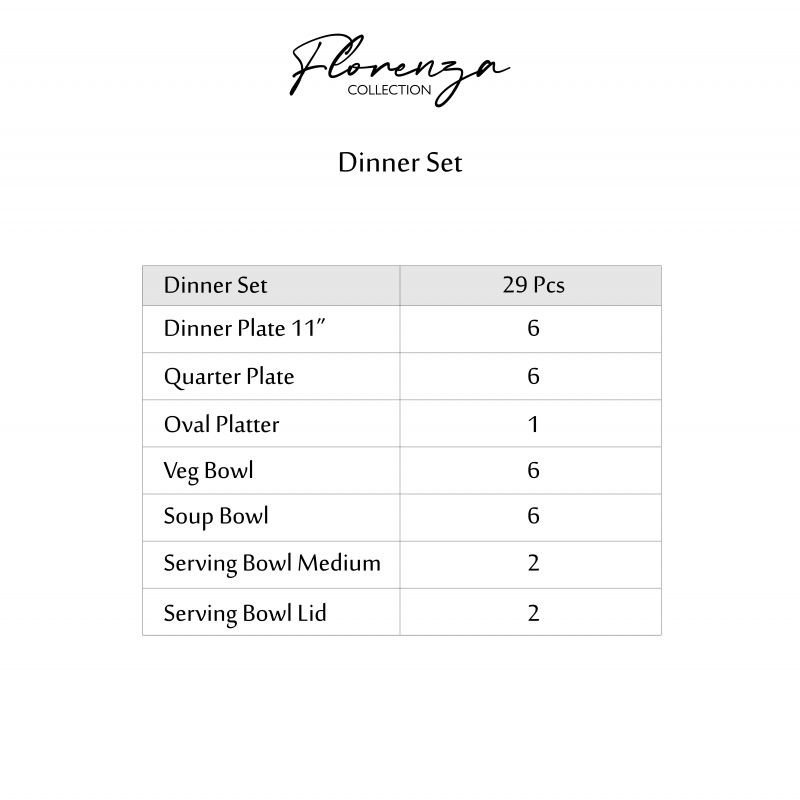 Diameter: Dinner Plate - 11 inch, Soup Bowl-4.7 inch, Quarter Plate - 7.9 inch, Veg Bowl - 4 inch, Serving Bowl - 7.9 inch, Oval Platter - 13 x 10 inch