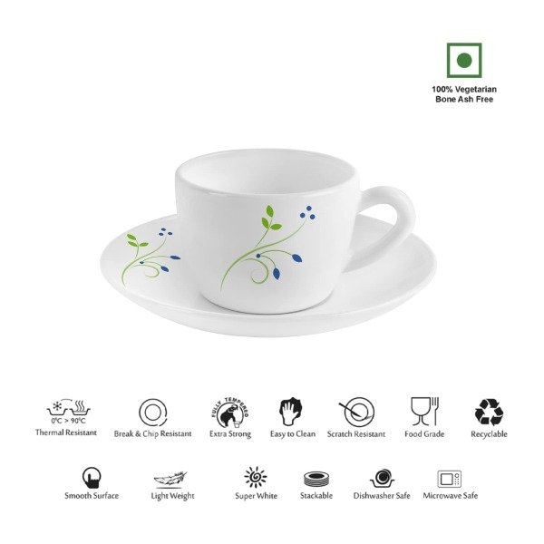 Each cup has a capacity of 130ml, making them the perfect size for enjoying your favorite hot beverage. Made from high-quality opalware material, these cups and saucers are resistant to chipping, cracking, and staining, making them a practical choice for everyday use.